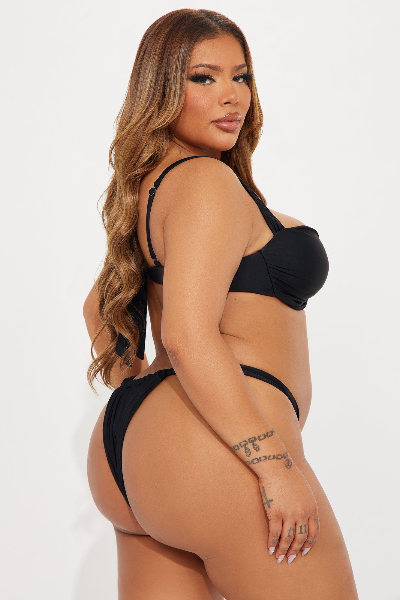Available In Black. 2 Piece Bikini Underwire Bikini Top Padded Wide Straps Side Strap Bikini Bottom High Leg Cut Ruching Cheeky Thong Full Stretch Final Sale 95% Polyester 5% Spandex Imported California Proposition 65WARNING: Cancer and Reproductive Harm - www.P65Warnings.ca.gov.