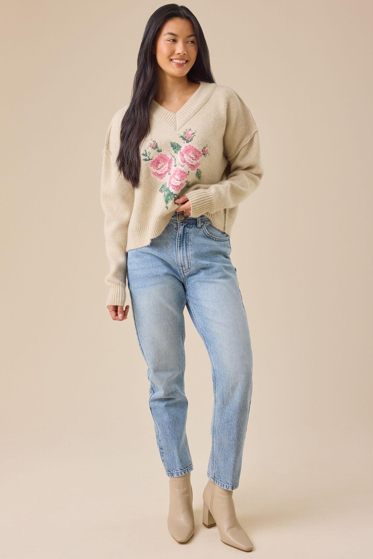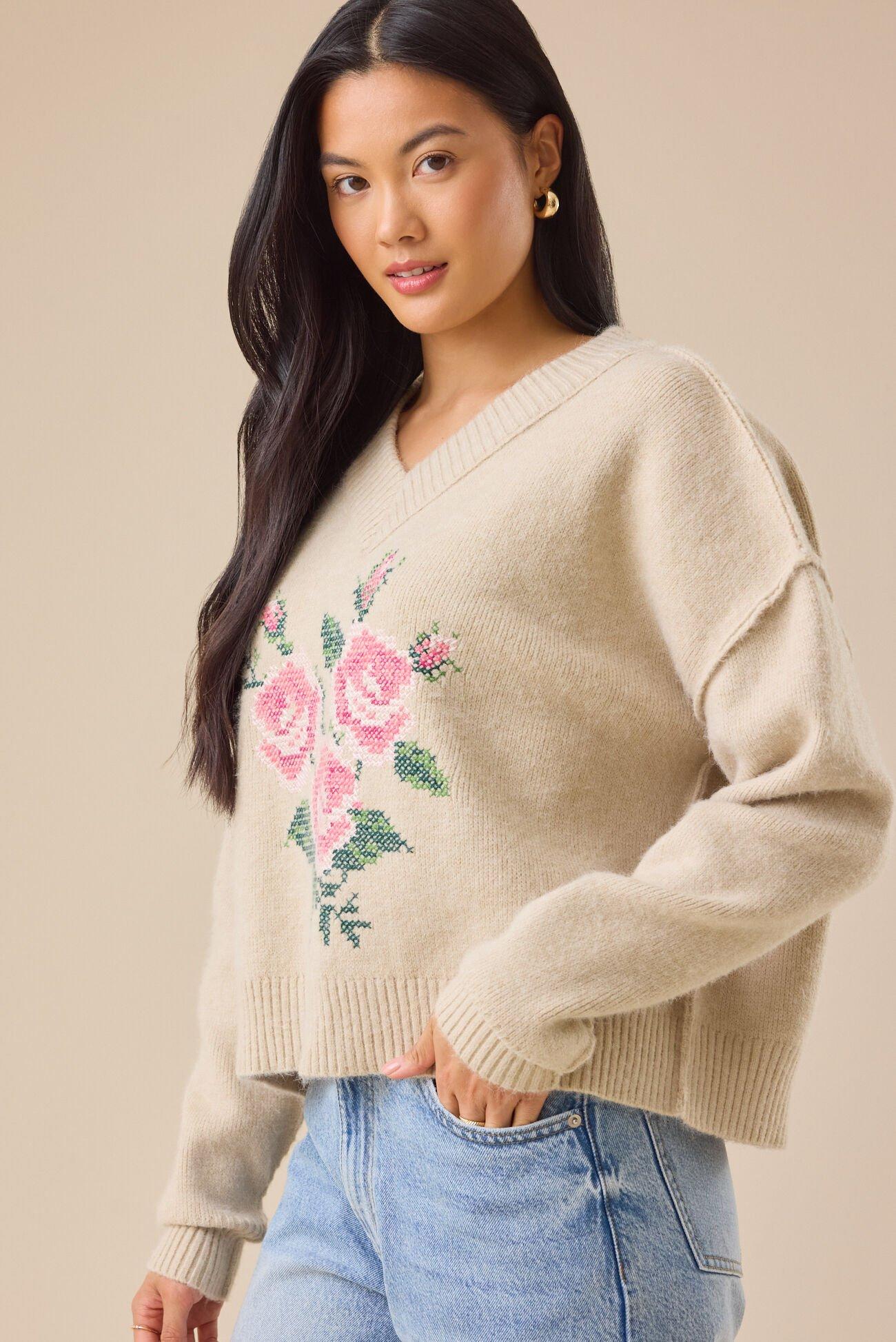 Add artisanal charm to your look with this V-Neck Floral Sweater. Featuring beautiful floral cross-stitch embroidery, its handcrafted elegance is sure to elevate any wardrobe.