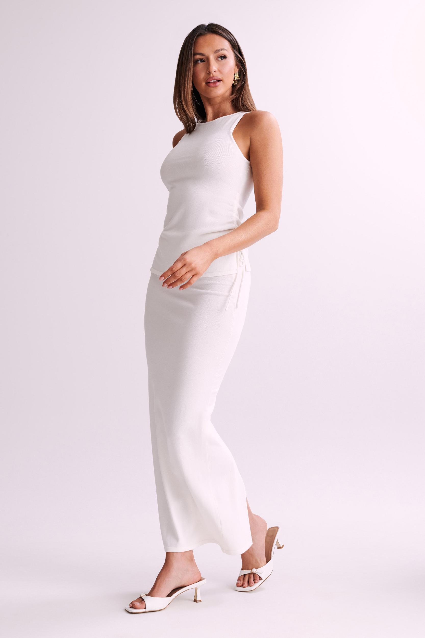 The start of a perfect set.TRISTAN is a modish top, constructed from soft knit material that promises comfort, longevity, and superior hand feel. The bodycon fit accentuates your figure beautifully, amplified with side seam ruching for a more flattering silhouette. The ruches are crafted with functional self-ties, allowing you to adjust both sides to your desired fit and style. It also features a high neckline with a sleeveless design, equipping you with a heat-ready ensemble for the sunny seasons. Pair with the matching Tristan Knit Maxi Skirt and heels for the complete look.