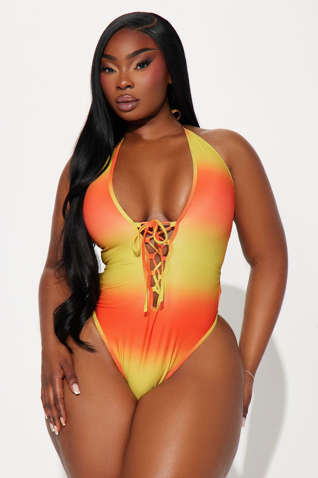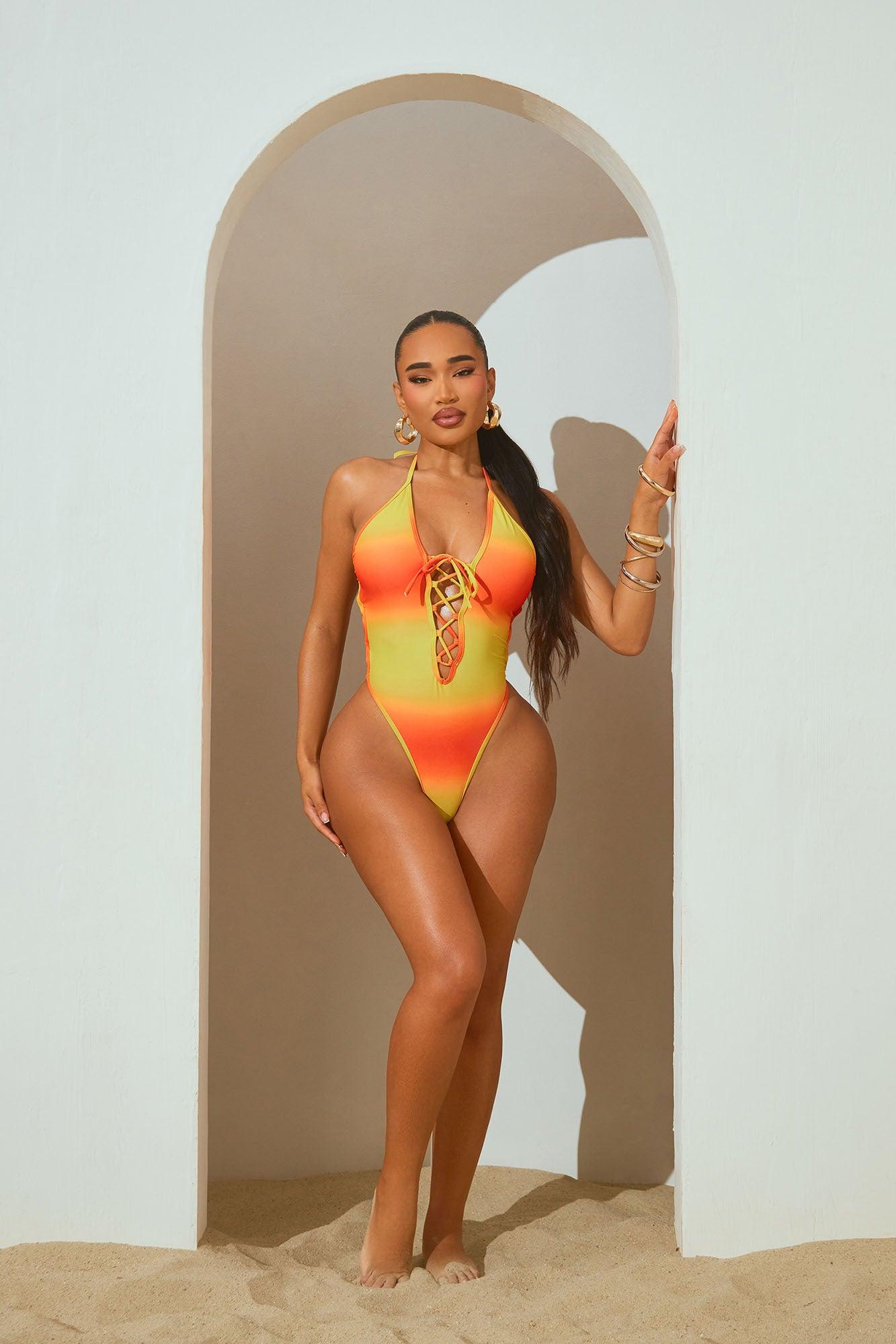 Available In Orange/combo. 1 Piece Ensemble Swimsuit Ombre Halter Deep V-Neck Adjustable Lace-Up Removable Cups High Leg Cut Cheeky Full Stretch Final Sale Disclaimer: Print Placement May Vary 85% Polyester 15% Spandex Imported California Proposition 65WARNING: Cancer and Reproductive Harm - www.P65Warnings.ca.gov.