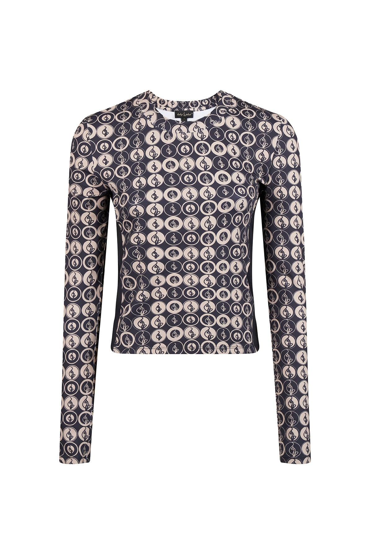 Printed crew neck long sleeve top Features contrasted paneling detail at the side seams Exclusive two toned Baby Phat cat logo all over print Unlined and fitted to the body’s natural curves Bra Friendly Color may vary due to lighting on images. The product images (without model) are closest to true color of the product