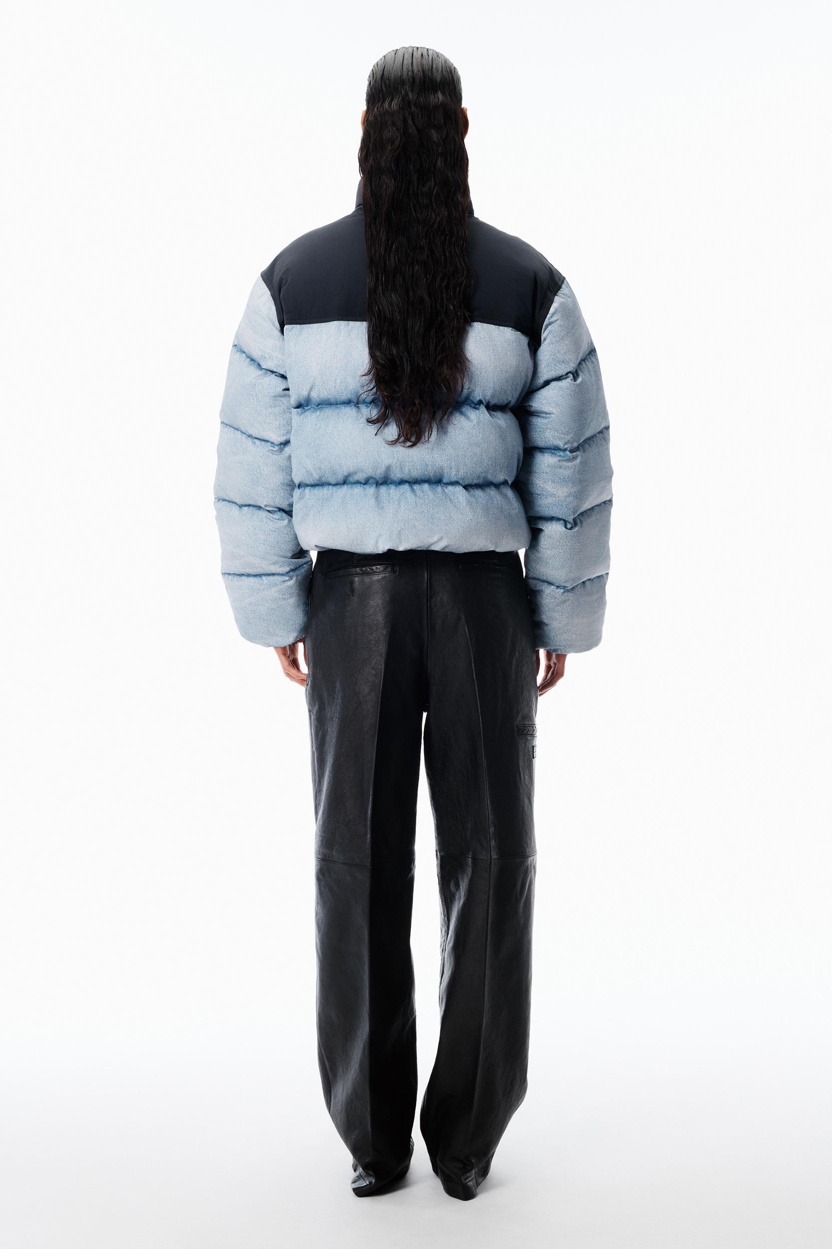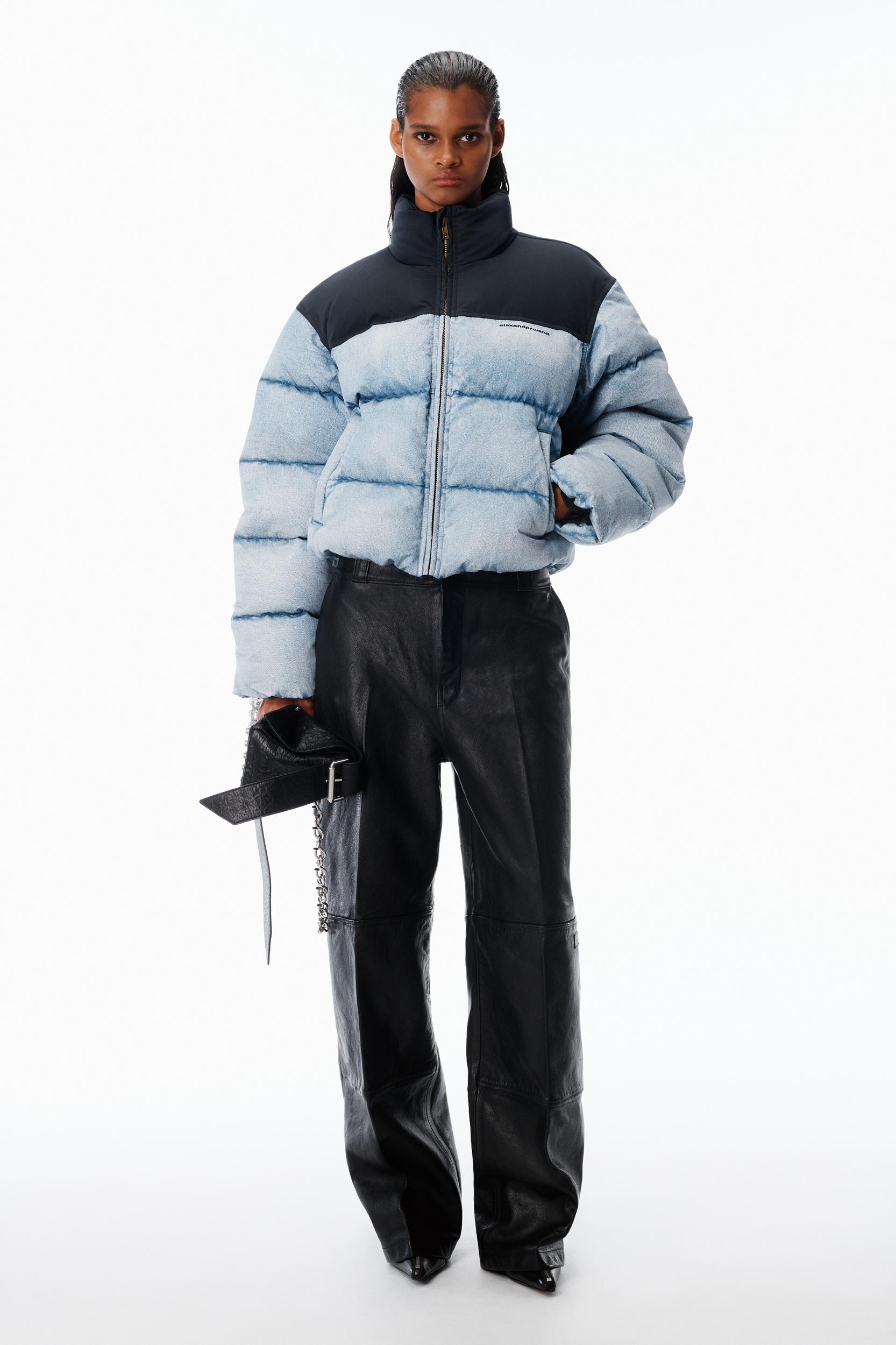 Cropped trompe l’oeil puffer jacket in light distressed blue/black technical nylon with a denim-inspired finish. Features a stand-up collar, dropped shoulders, front zip closure with zipper guard, and contrast yoke panels at front and back. Includes welt pockets with hidden snaps, elasticated cuffs, tonal chest logo embroidery, and an adjustable bungee hem for customizable fit.