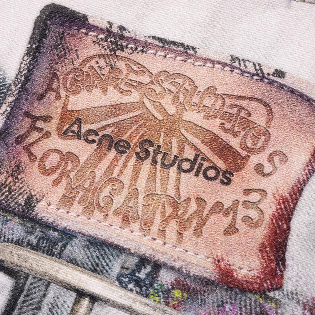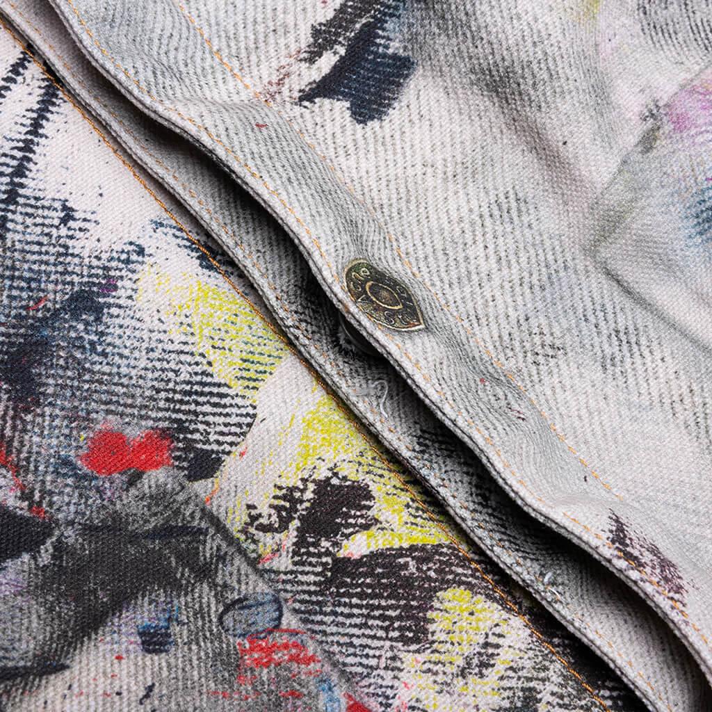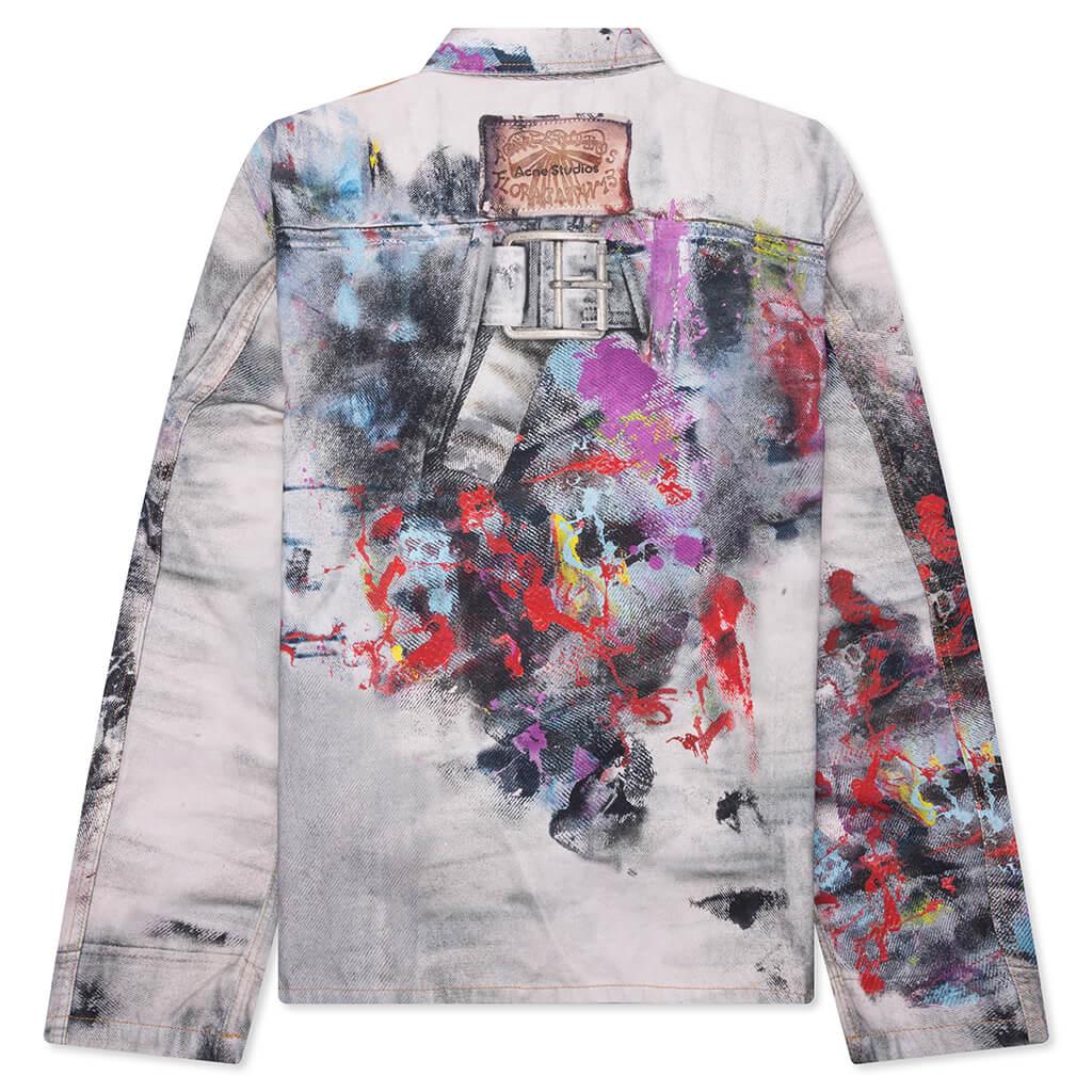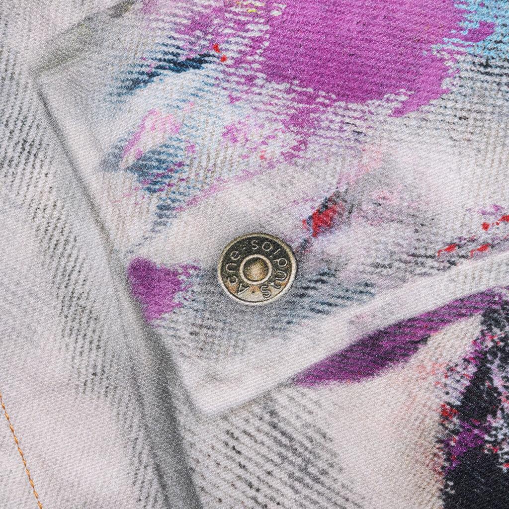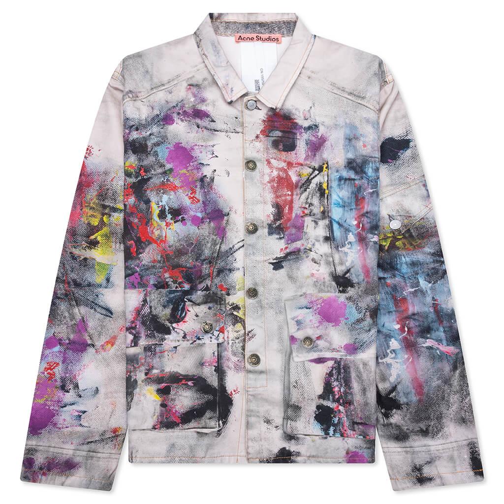 Acne Studios introduces a bold, artistic statement piece with the Trompe L'oeil Jacket. Crafted from brushed cotton canvas, it features a striking all-over print that creates the illusion of layered textures and paint strokes. The regular-fit jacket is finished with a front button closure, front pockets, and a flat sleeve pocket. 100% Cotton Regular fit Hip length Seasonal trompe l'oeil print Front button closure Flat sleeve pocket and front pockets Custom hardware Style No: B90859-AOL