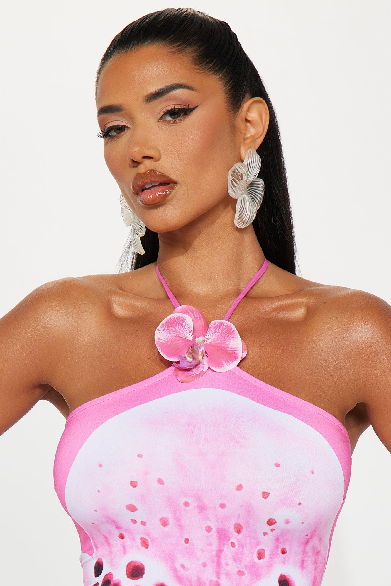 Available In Hot Pink. Floral Midi Dress Y-Neck Halter 3D Floral Applique Backless Stretch Length Measured Flat = 32" Disclaimer: Print Placement Will Vary. Self: 80% Polyester 20% Spandex Imported California Proposition 65WARNING: Cancer and Reproductive Harm - www.P65Warnings.ca.gov.
