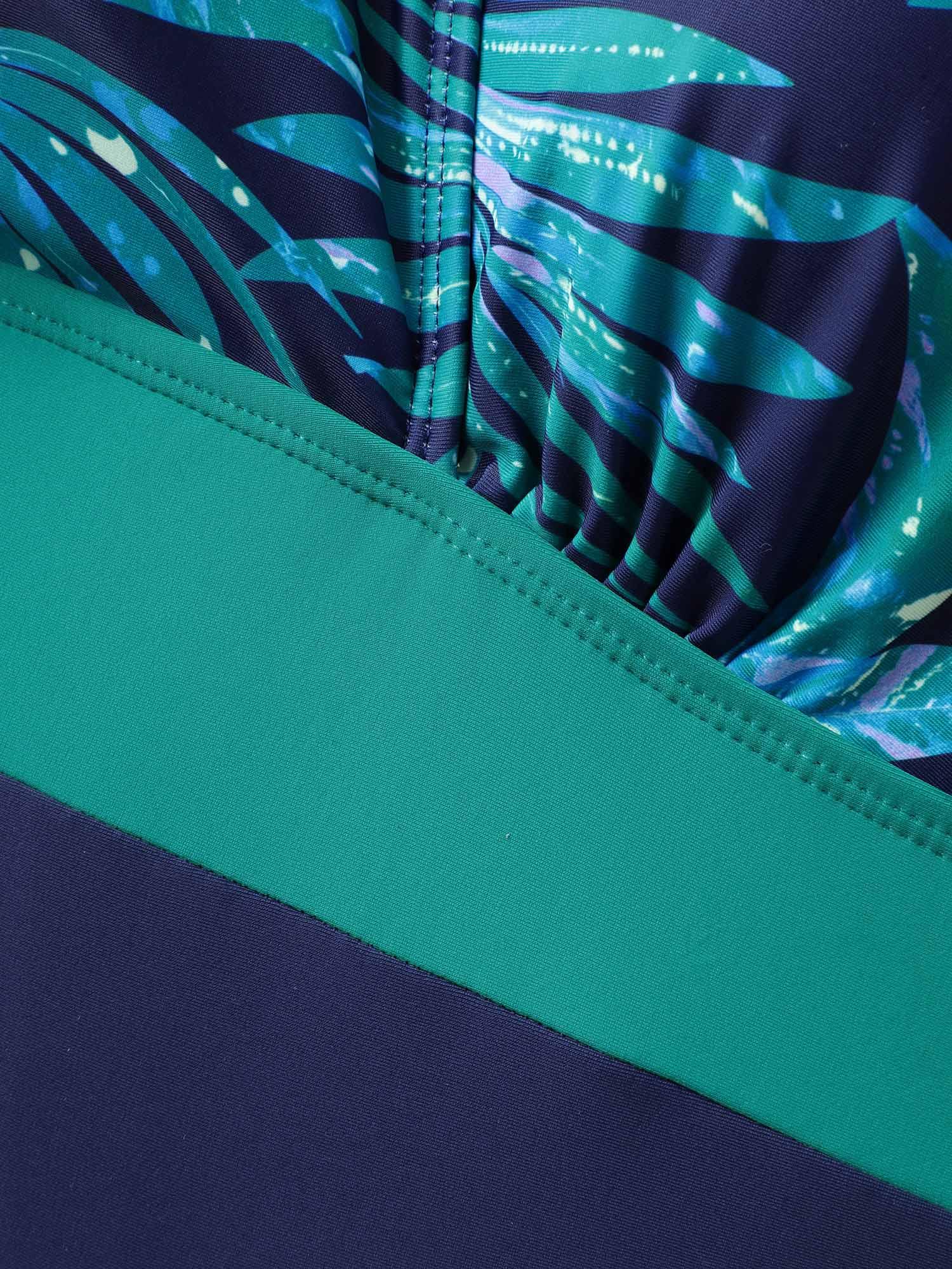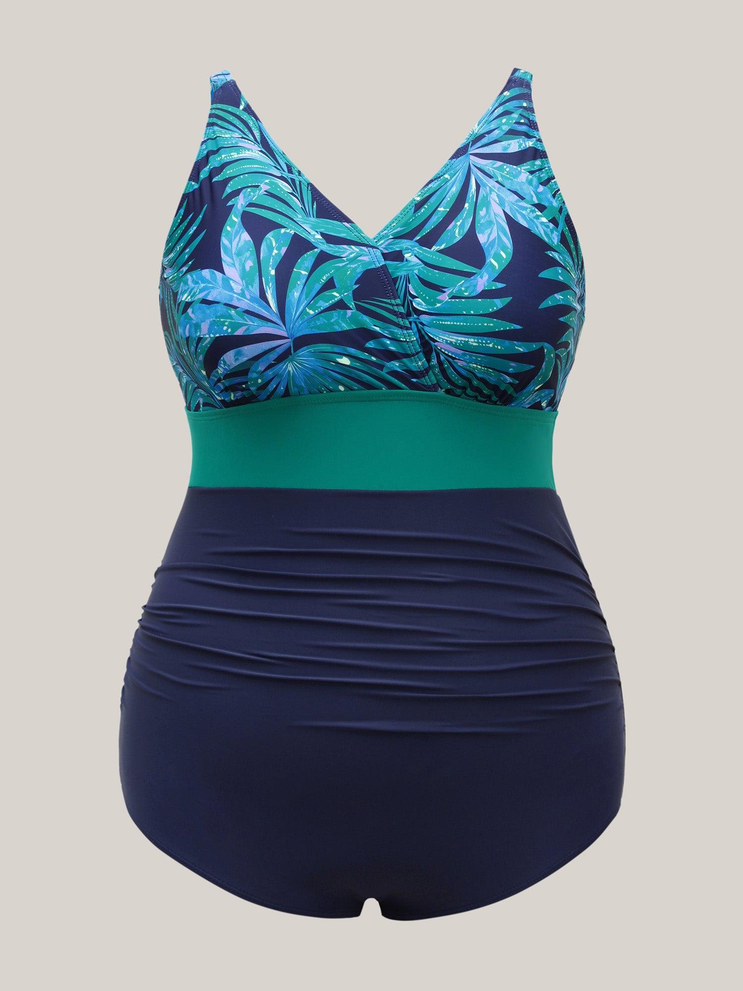 Shop Tropical Color Block One-Piece Swimsuit now and redefine your style with confidence at BloomChic. Tailored for mid and plus-size women. This trendy Swimwear Women, sizes 10-30. Color:Emerald;Style:Beach;Cup Type:Removable cups;Neckline:Overlap Collar;Sleeve Type:Sleeveless;Prints:Tropical;Details:Contrast, Gathered;Pocket:No-pocket;Belt:No-belt;Chest pad:Removable Padding;Lining:Lining;Closure Type:Non;Structural function:Tummy-Sculpt,Adaptive-Fit