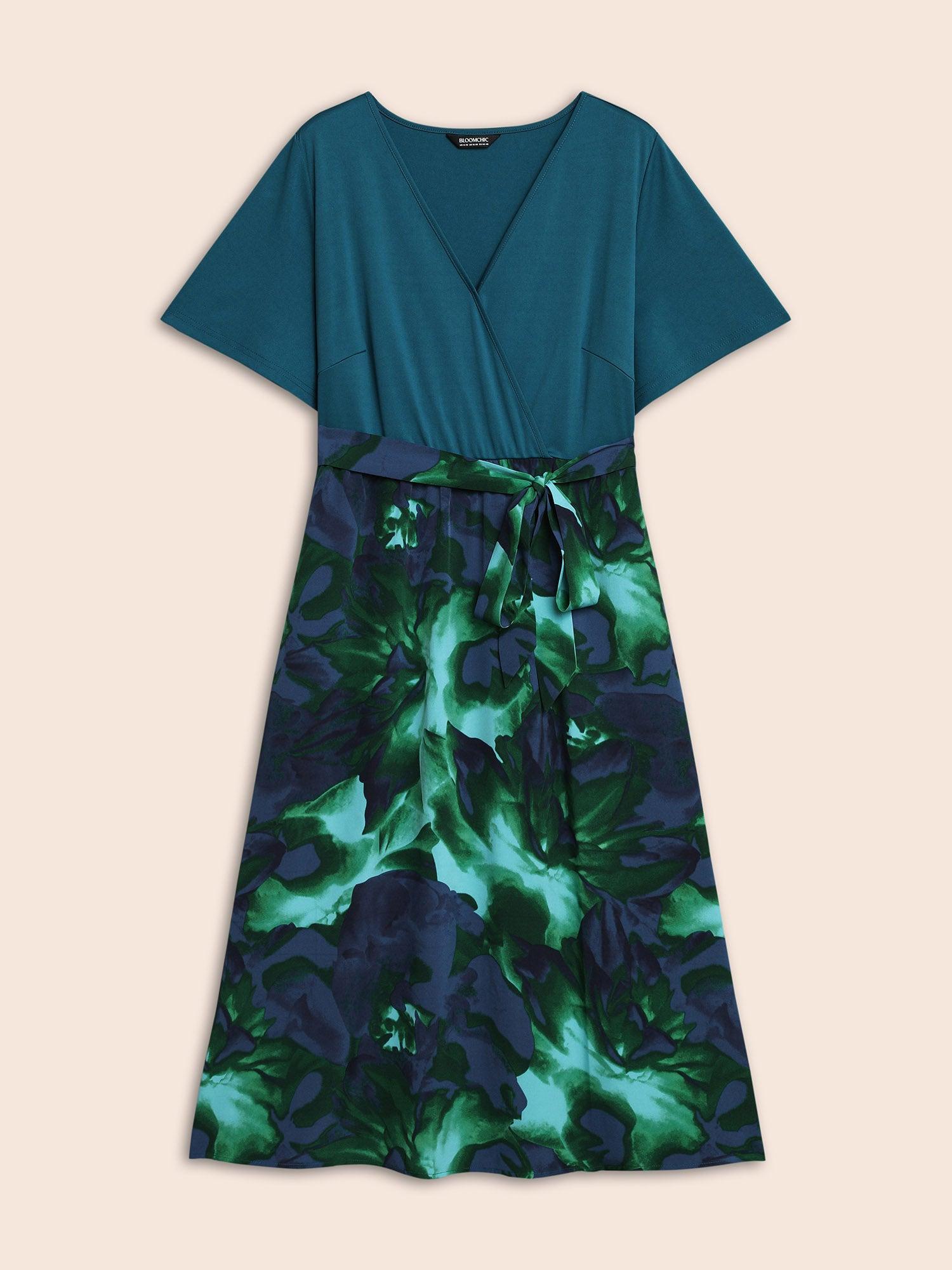 Shop Tropical Print Wrap Neck Waist-Tie Dress now and redefine your style with confidence at BloomChic. Tailored for mid and plus-size women. This trendy Dresses Women, sizes 10-30. Color:Emerald;Style:Elegant;Neckline:Overlap Collar;Sleeve Type:Ruffle Sleeve;Prints:Gradient dyeing;Details:Patchwork, Belted;Pocket:Side seam pocket;Belt:Belt;Closure Type:Non