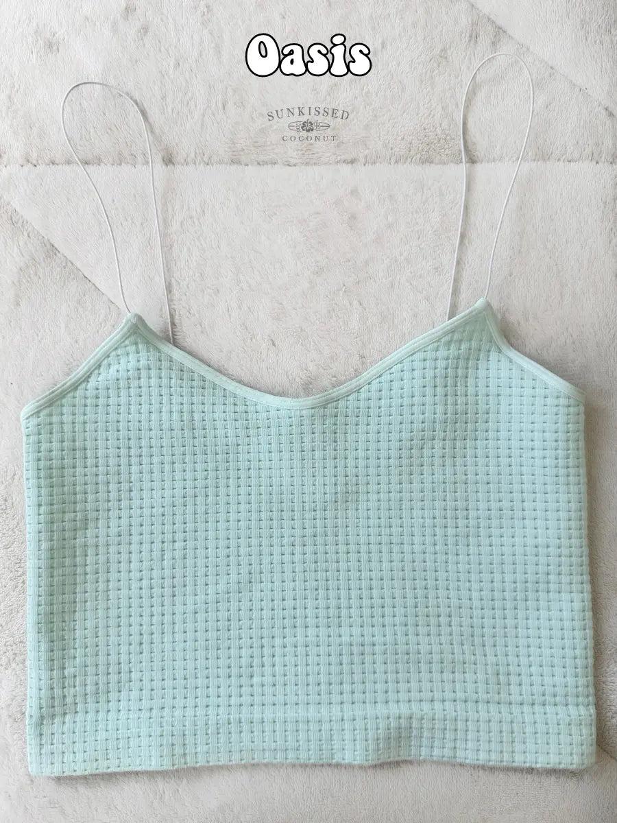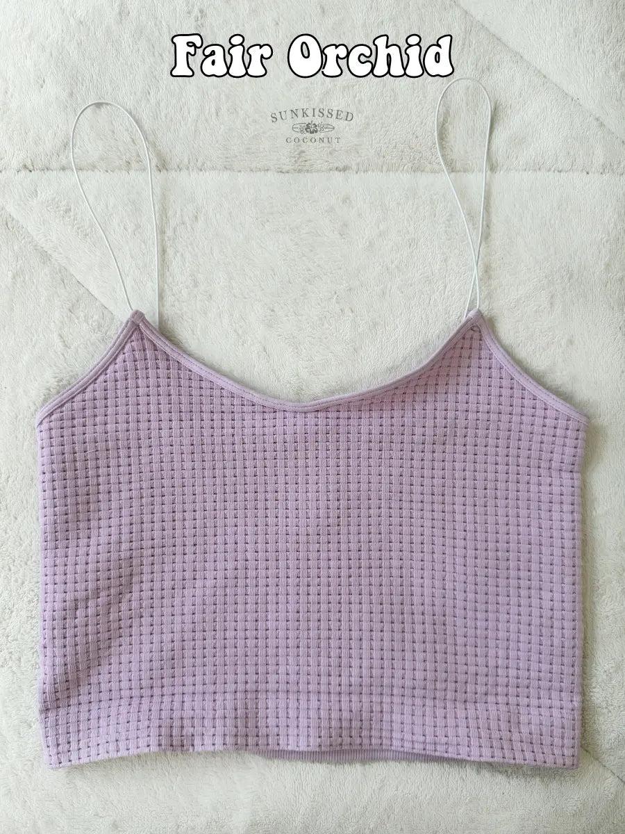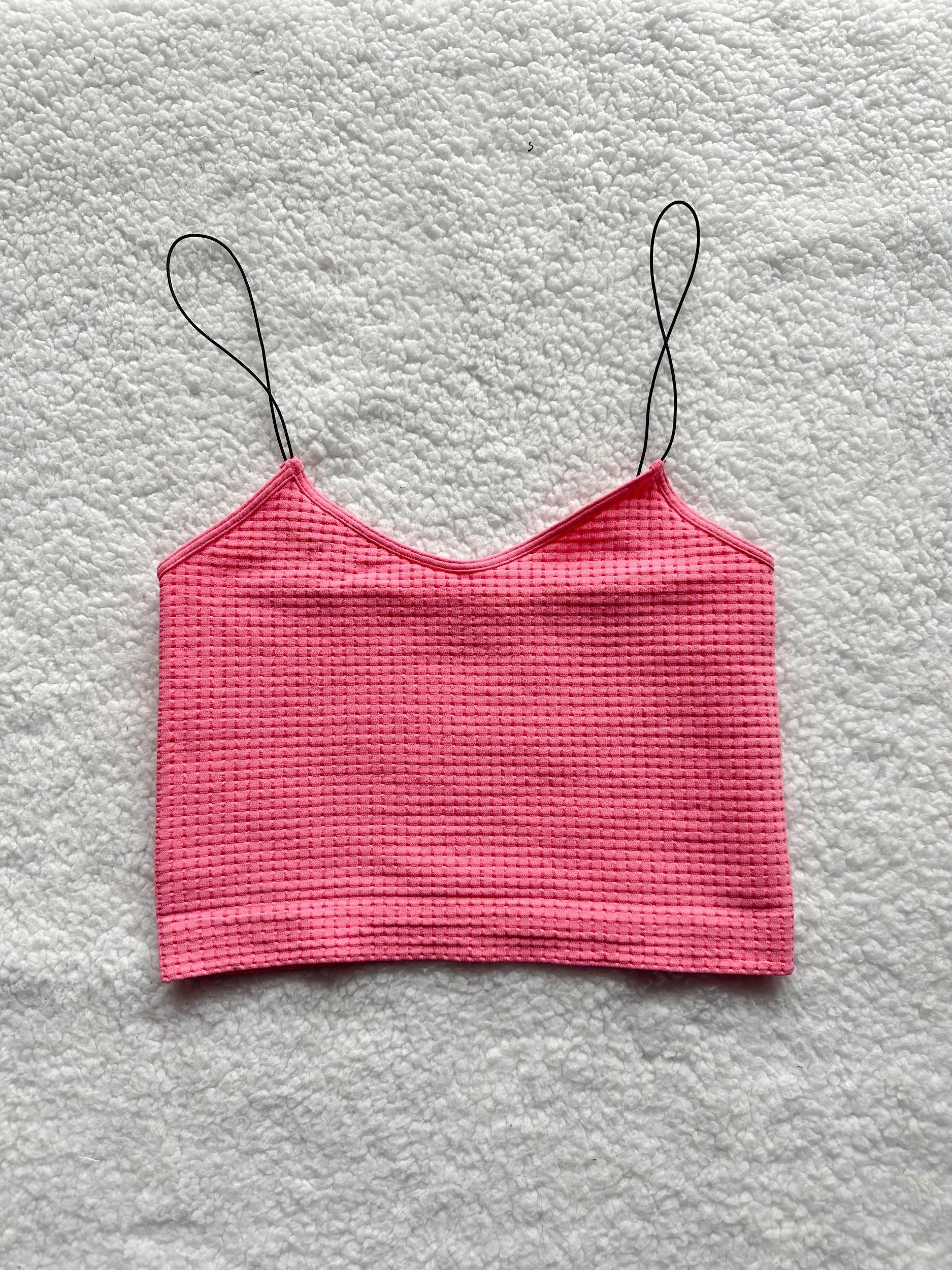 Made in USAFabric: 92% Nylon / 8% SpandexA seamless cropped cami featuringwaffle texture and skinny elastic straps. Although this product is one size, the material allows it to fit sizes small-XL. Nervous on if you think this product will fit? Definitely order one and give it a chance! I PROMISE you will fall in love with these tank tops!
