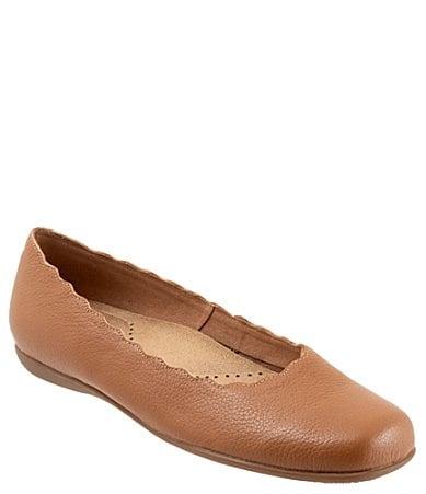 From Trotters, the Sabine Leather Scalloped Slip-On Flats feature:Leather upperScalloped toplineSlip-on styling UnlinedSueded microfiber footbed materialRemovable footbed with arch supportRubber outsoleApprox. 0.63 heel heightImported.