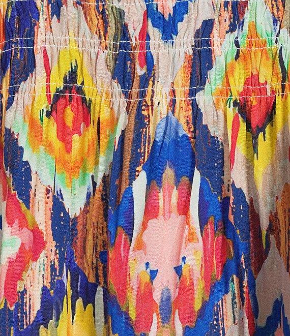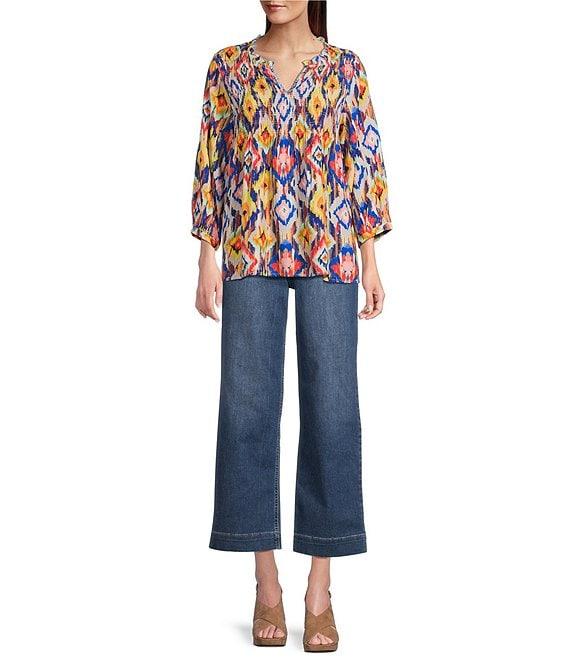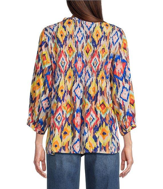 From Tru Luxe Jeans, this top features: Challis fabrication Abstract diamond print Split v-neckline 3/4 sleeves Ruffle collar Banded cuffs Smocked bodice Straight hemline Pullover construction Approx. 26.5" length Rayon Machine wash cold/tumble dry low Imported.