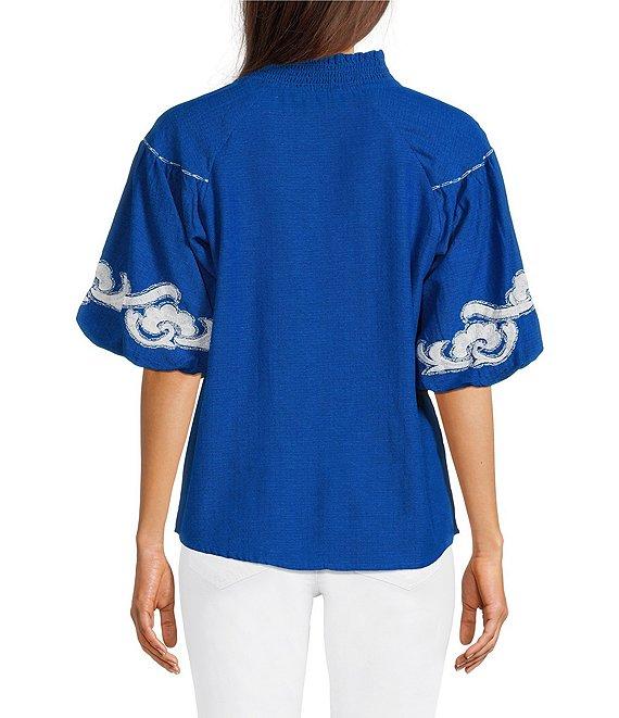 Tru Luxe Jeans Dobby Embroidered Smocked V-Neck Short Bubble Sleeve Top