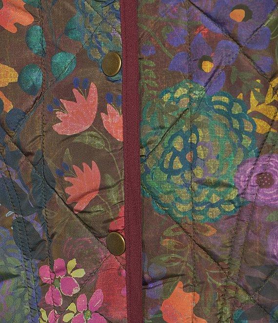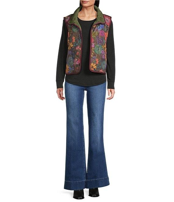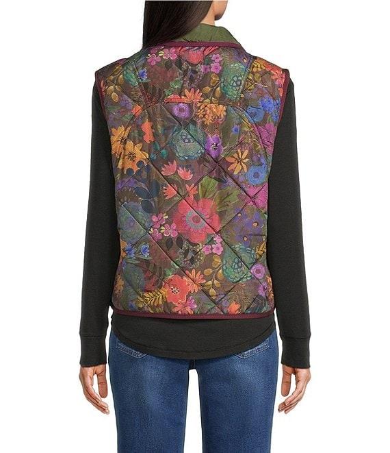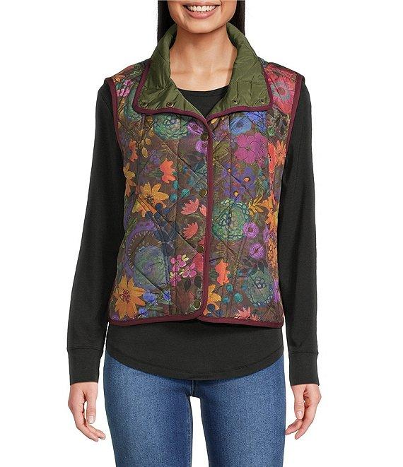 Tru Luxe Jeans Quilted Floral Convertible Collar Sleeveless Snap Front Vest