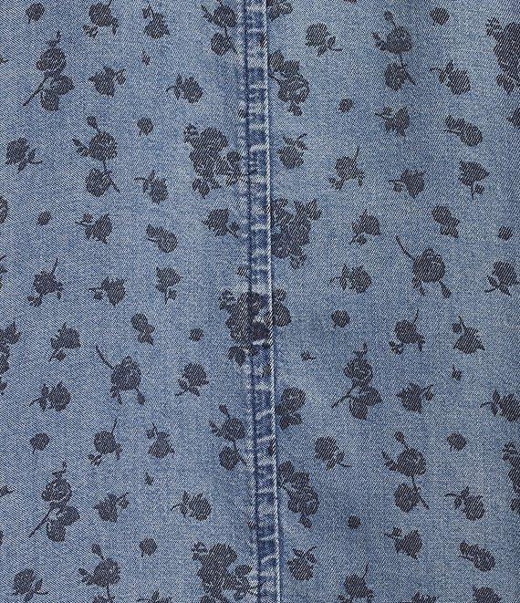 Tru Luxe Jeans Tonal Floral Chambray Point Collar Roll Tab Sleeve Button Front Shirt