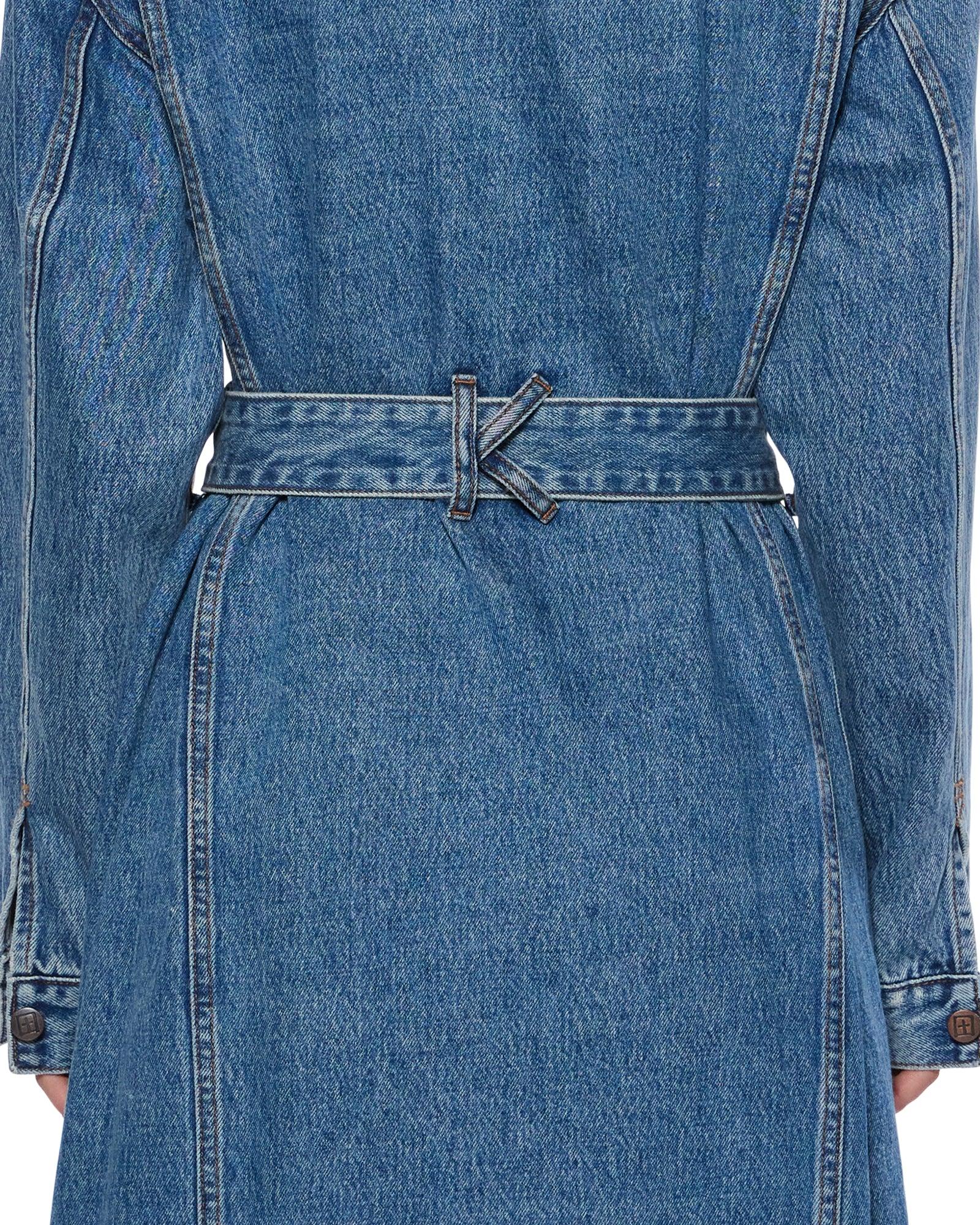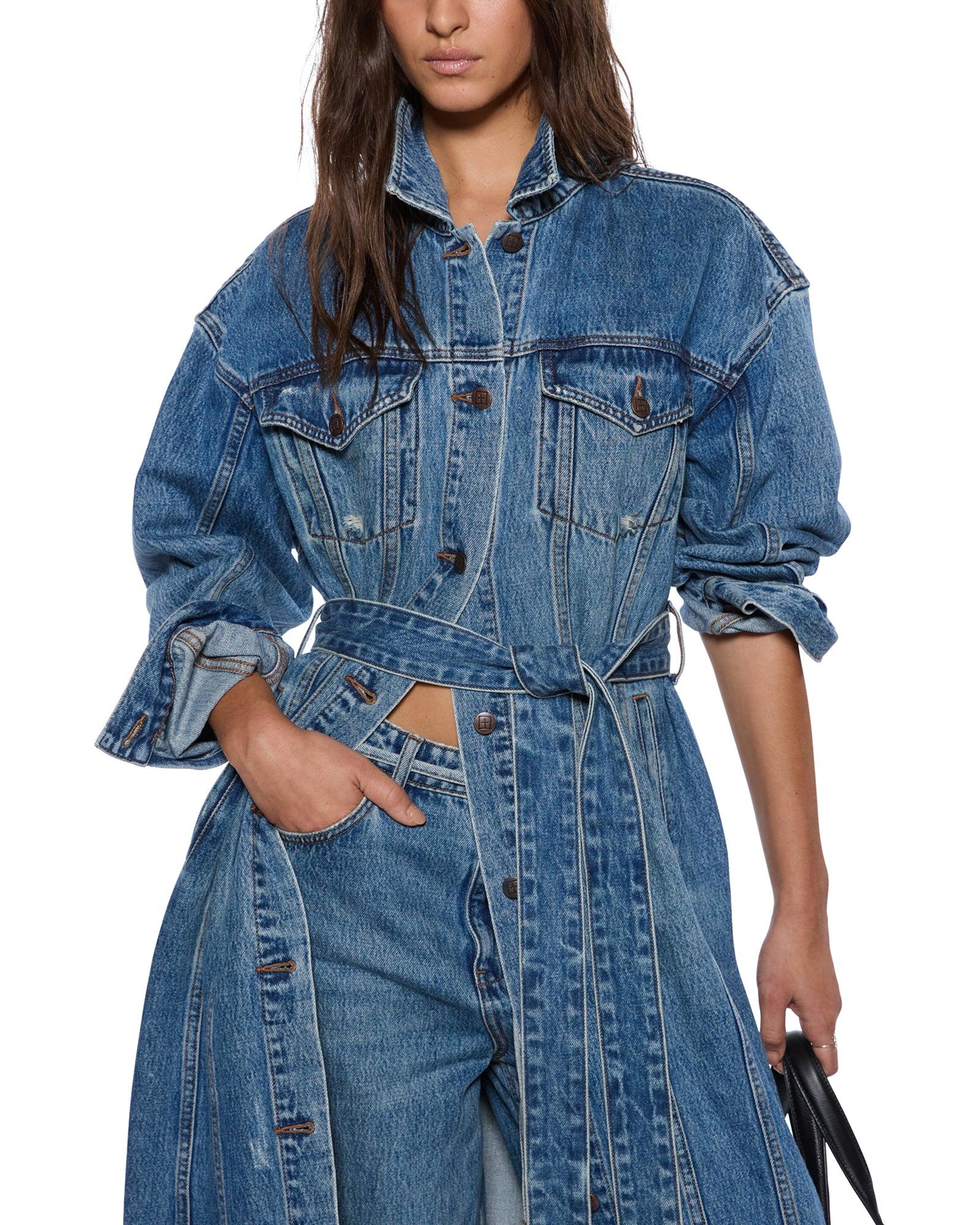 The Trucker Coat Relik is an oversized fit, long-line jacket featuring a button closure, dropped shoulders, and front panel detailing with pockets. Made from premium rigid denim in a mid-blue enzyme wash with a neutral tint, it shows signs of wear with subtle grinding at the collar, pockets, and seams. The jacket features single welt pockets, front patch pockets, and a removable self-belt with anti-copper Ksubi branded hardware, finished with T-box and 3x4 embroidery.