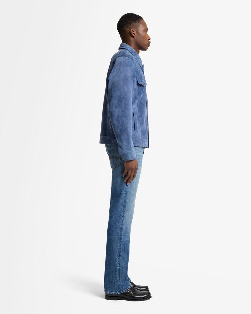 Fits like: A relaxed and slightly roomy jacket that sits neatly at the top of the waist.Feels like: Thick, durable structure with a soft, velvety texture made out of 100% Italian suede leather. The Details: 100% Leather Made in Italy Straight point collar A unique, muted blue shade Front detailing with silver hardware