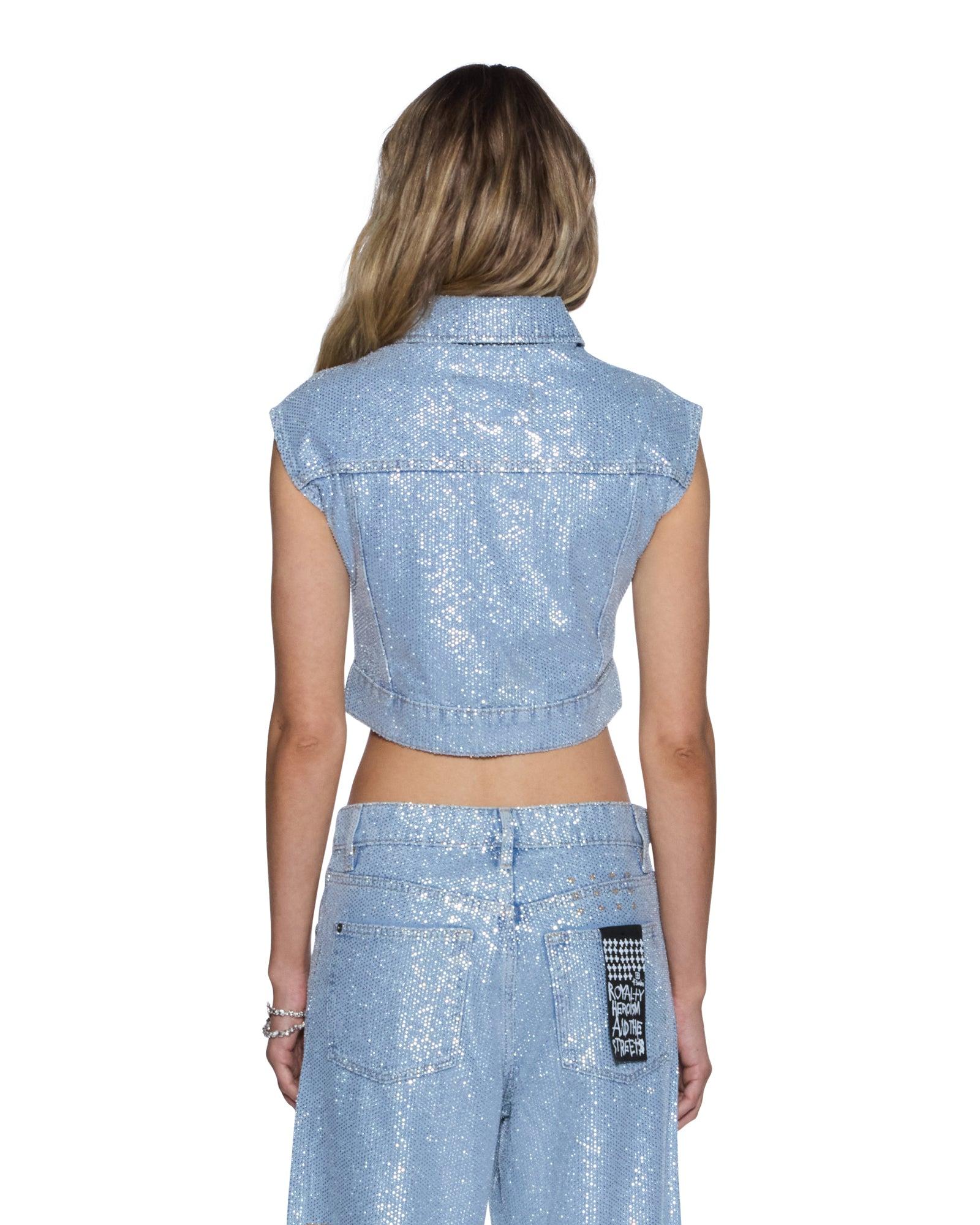 The Trucker Vest High Rollers is a sleeveless, cropped, fitted trucker vest made from premium European rigid denim in a light blue wash with an enzyme-soft finish. Densely embellished with all-over diamante hotfix crystals for a statement look, it features classic trucker panel detailing, front flap pockets, anti-silver Ksubi-branded hardware, and is finished with signature T-box and 3x4 embroidery.Please note this style is delicate; handle with care.