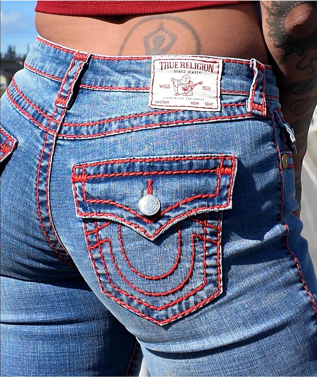 Add a nostalgic Y2K vibe to your outfit with the Becca Super T jeans from True Religion in a "California Poppy" light blue colorway. Providing a mid-rise bootcut fit, these jeans have pink and white contrast stitching, while embroidered branding ador