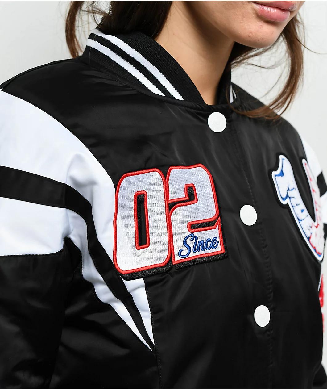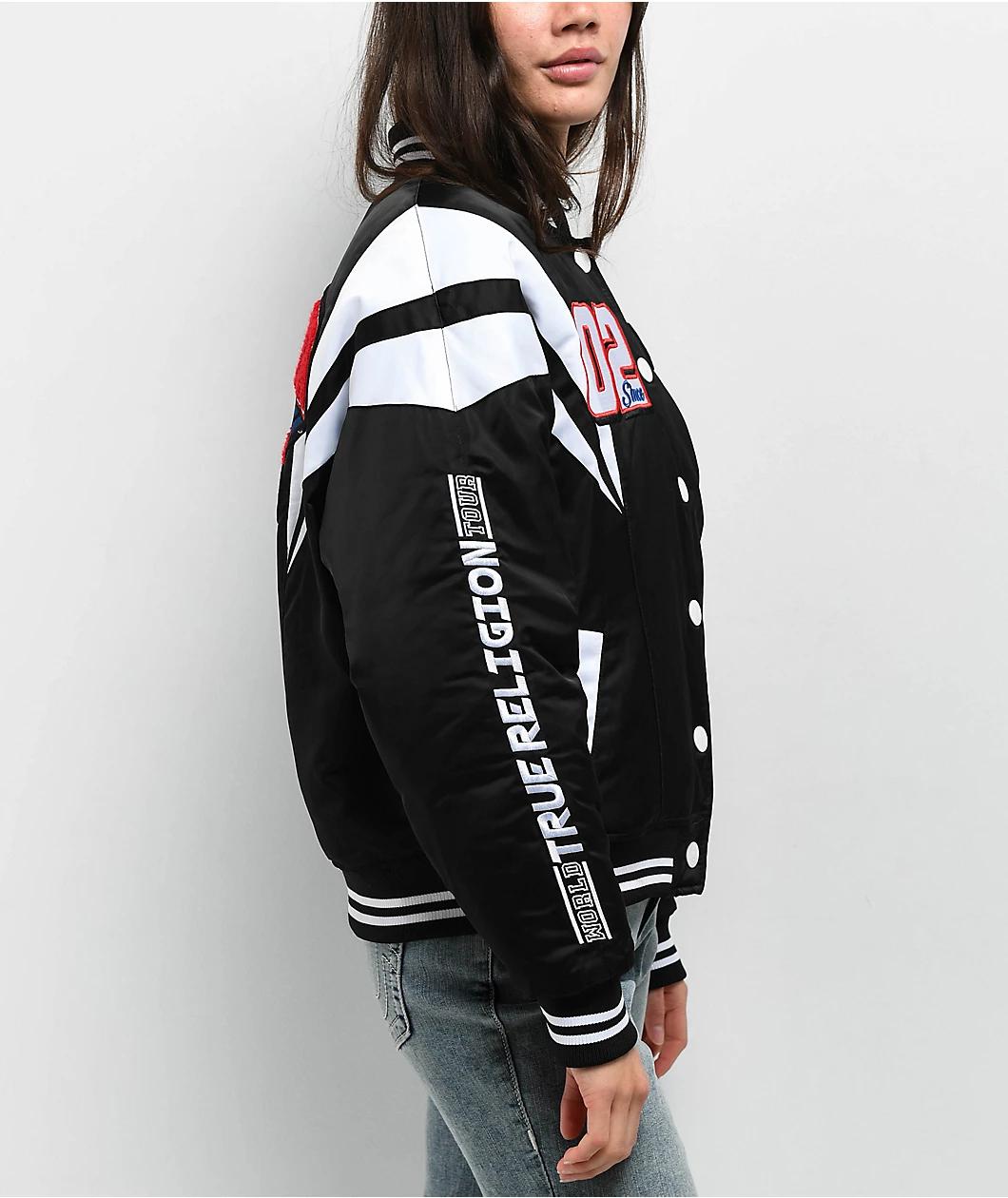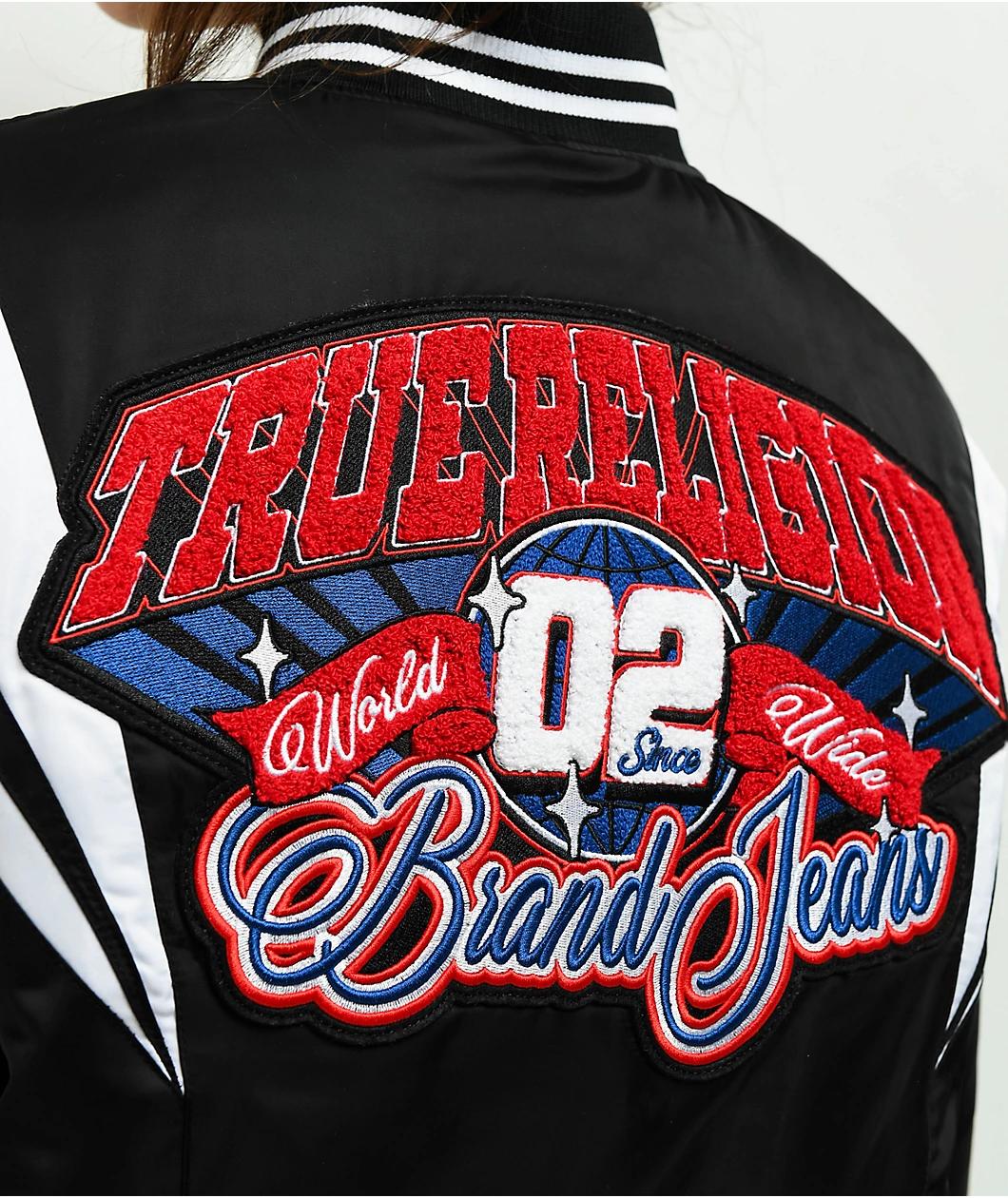 Designed by True Religion in a solid black hue, the Satin varsity bomber jacket offers a sports-inspired look with an insulated 100% polyester construction. Showcasing colorful chenille patches embroidered on the left chest, left sleeve and back, the