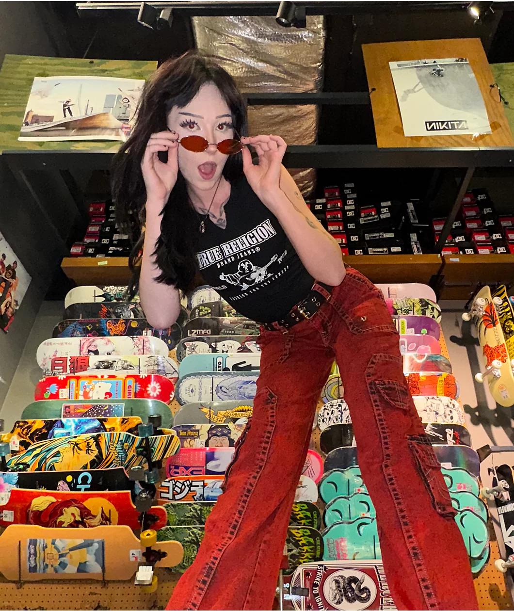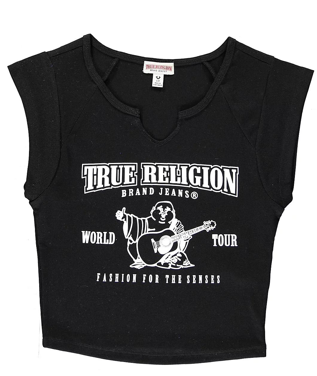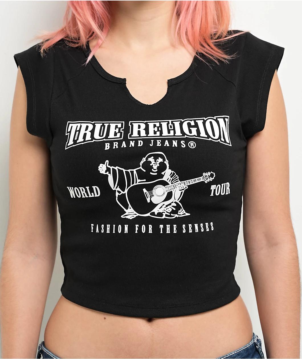 Form-fitting with a black rib-knit polyester blend, True Religion offers the Buddha Logo t-shirt in a cap sleeve silhouette with a notched crewneck collar for classic Y2K style. Thick screen-printed branding on the front of the tee adds a slight lift