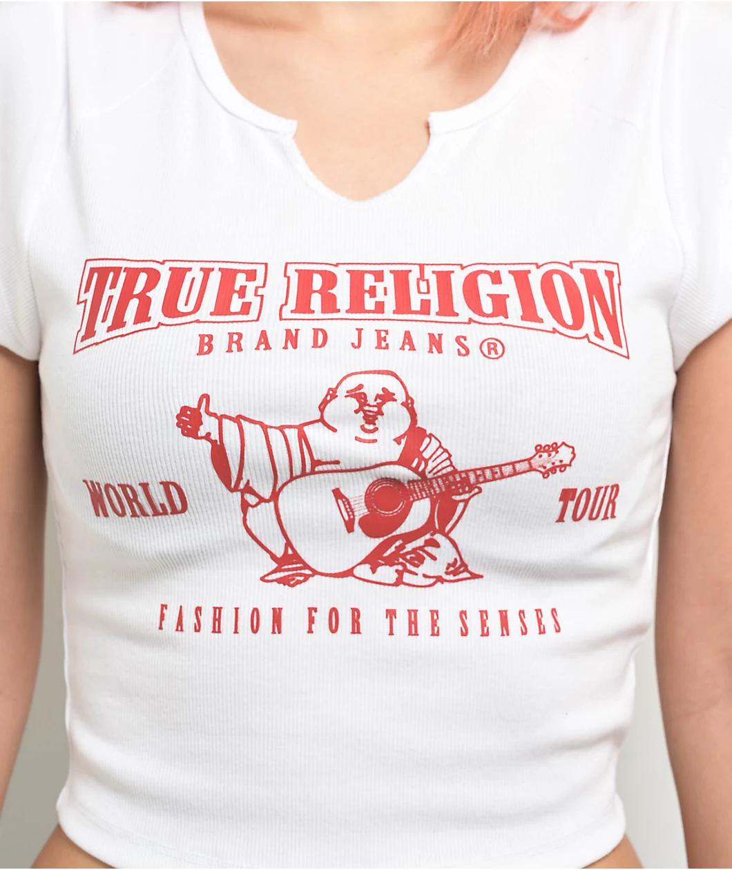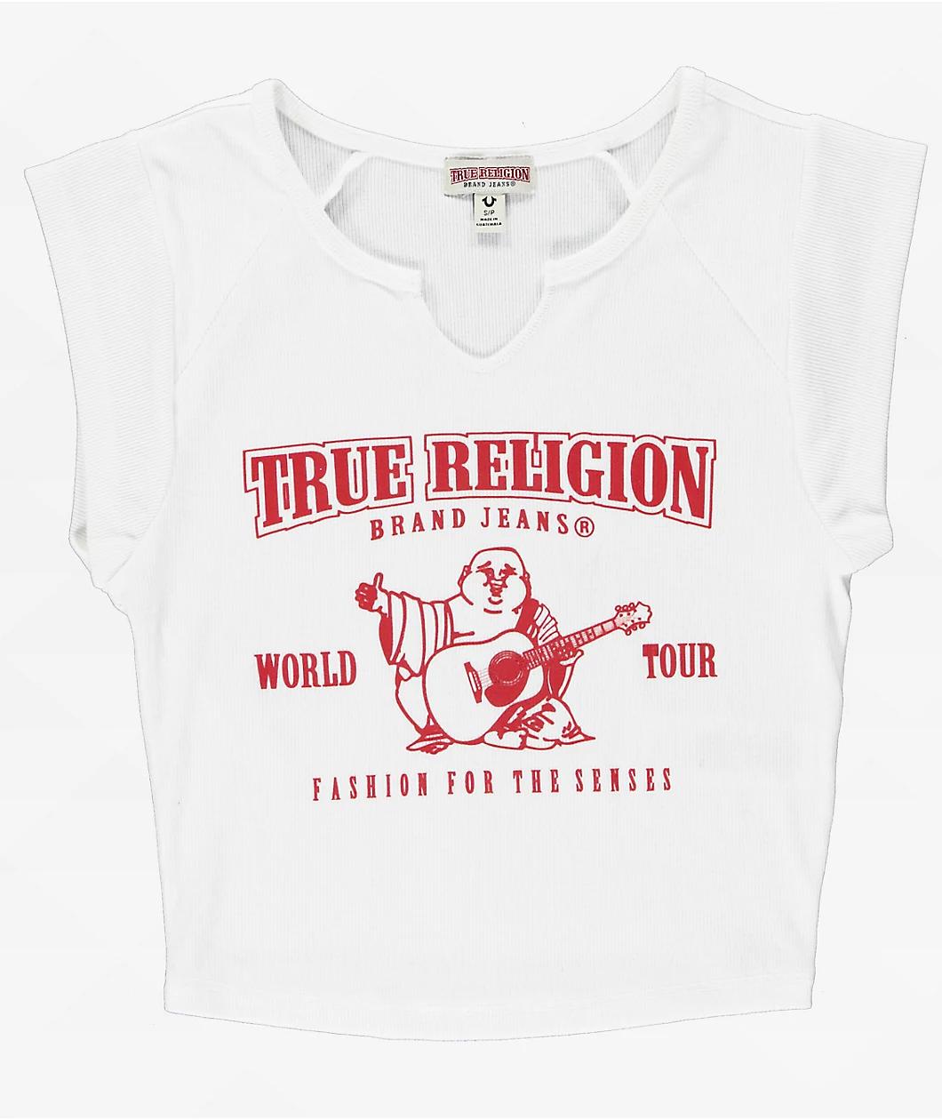The Buddha Logo Notch t-shirt arrives from True Religion in a white ribbed polyester build with a cropped cap sleeve silhouette for a slim-fitting look. Showcasing the brand's mascot on the front in a dense red, screen-printed design with bold text b