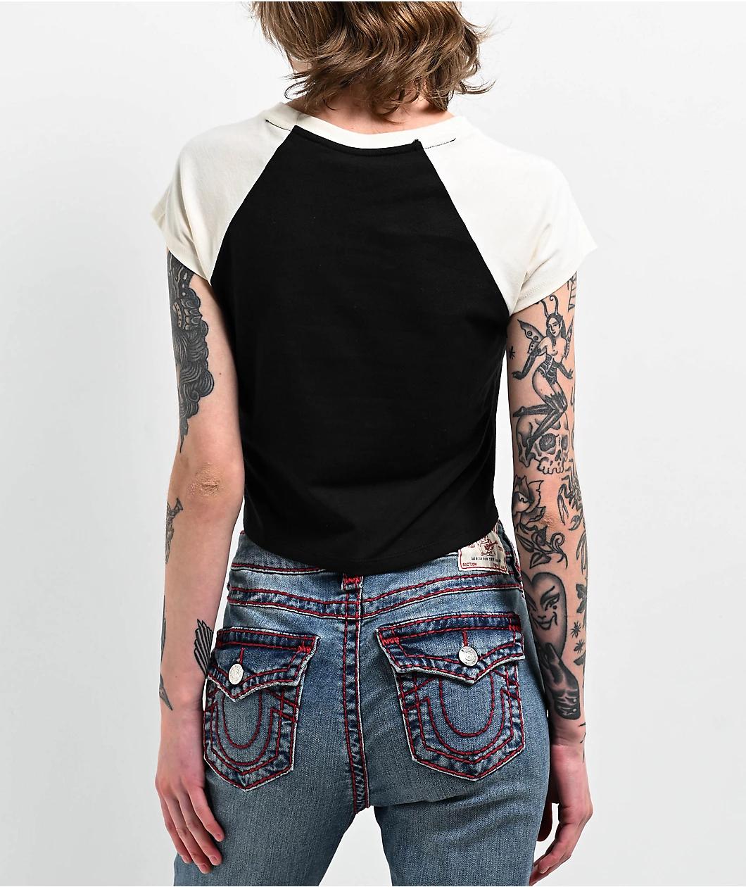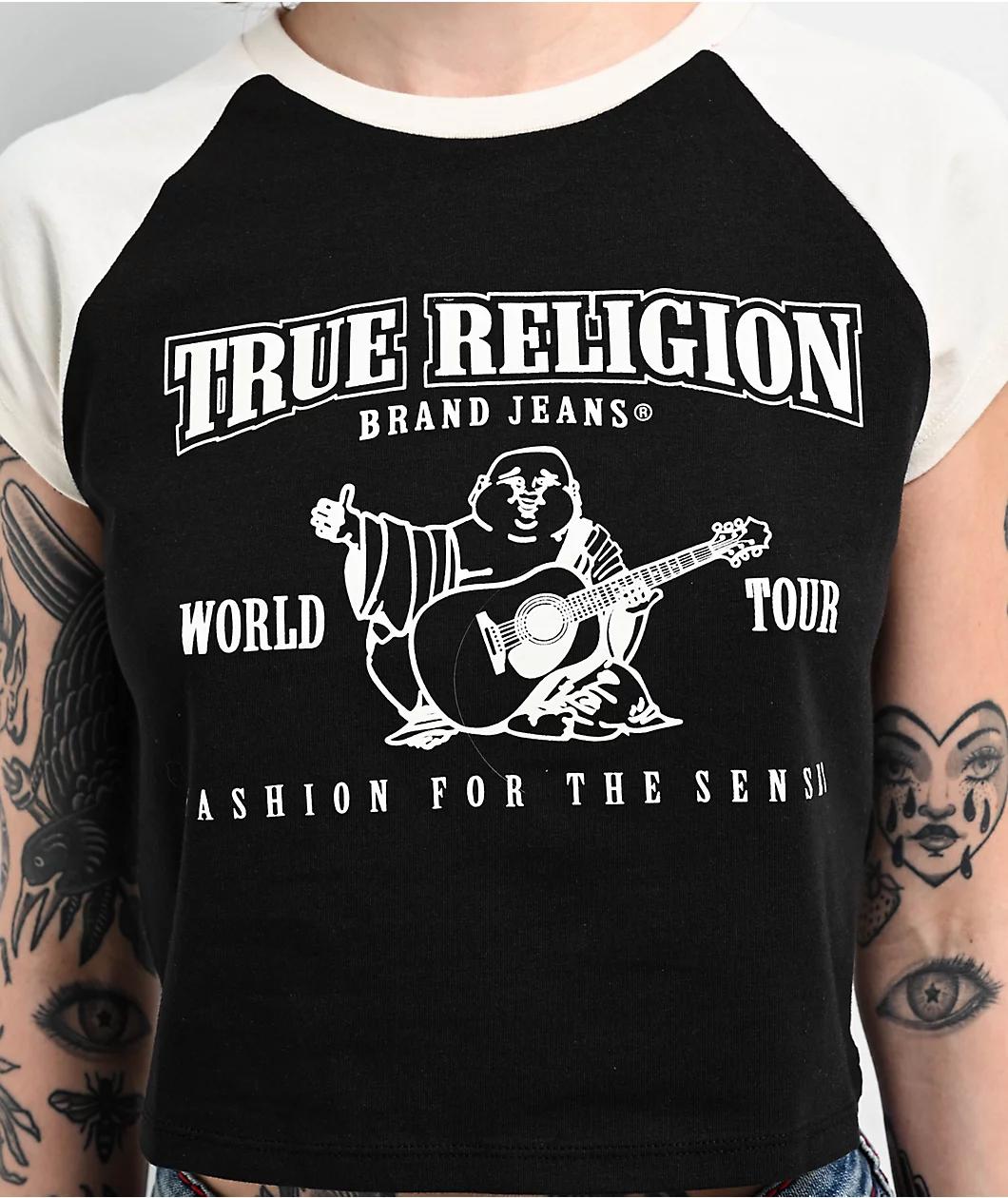 The Buddha Logo Ringer t-shirt arrives in a black cotton blend from True Religion with a cropped, raglan silhouette and a noticeable printed graphic on the front. Breathable and stretchy, the short sleeve baby tee features arched bold branding above