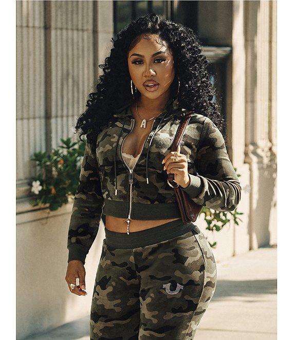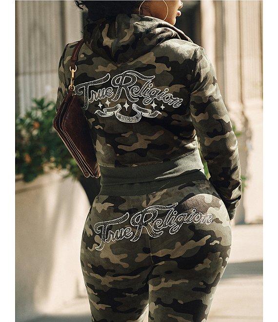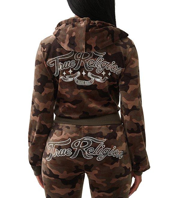 From True Religion, this hoodie features: Velour fabrication Camo print Drawstring hood neckline Front zipper closure Long sleeves Split kangaroo pocket detail Chest crystal horseshoe Back crystal logo Cropped fit Approx. 18.5" length Polyester/elastane Machine wash Imported.