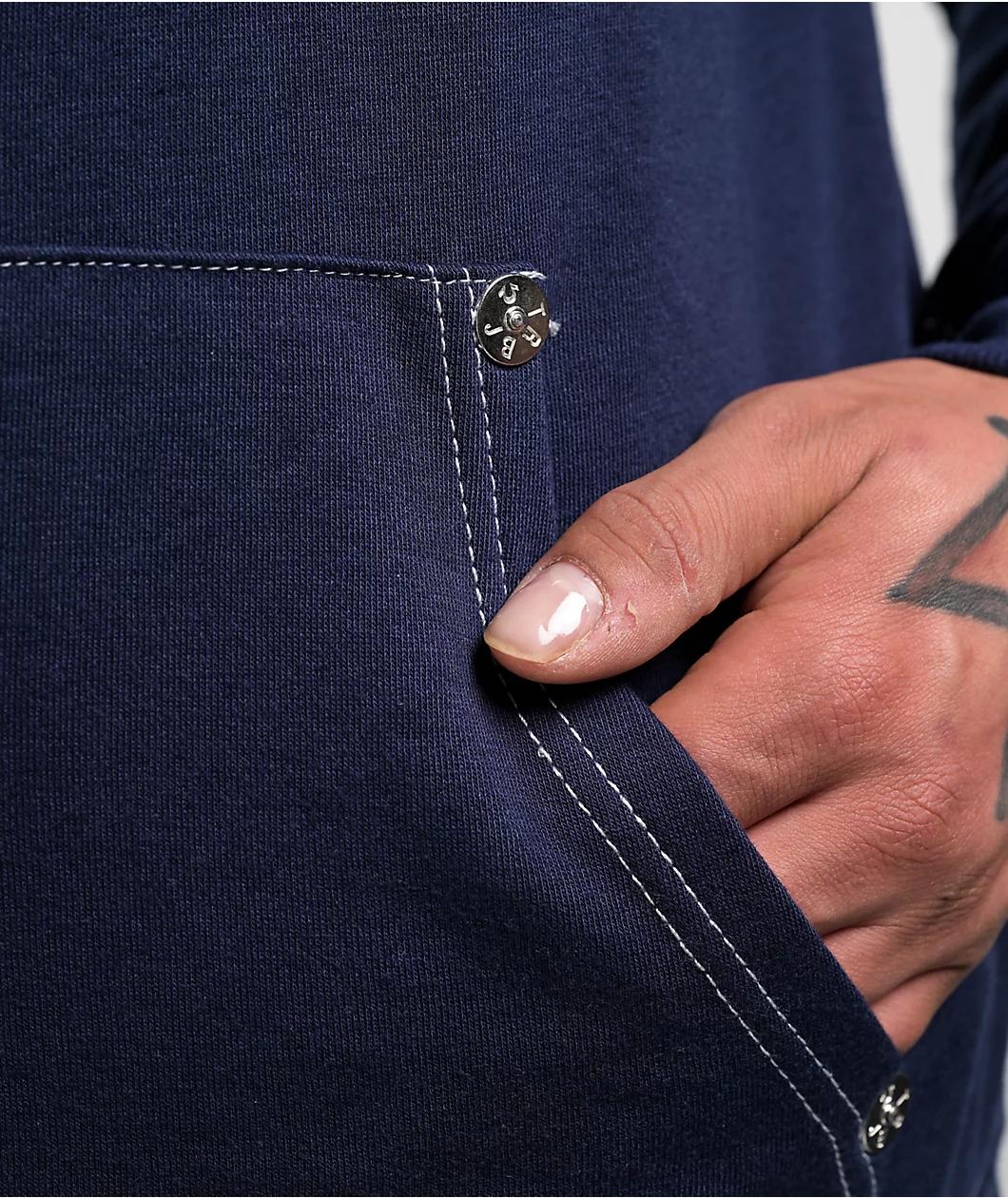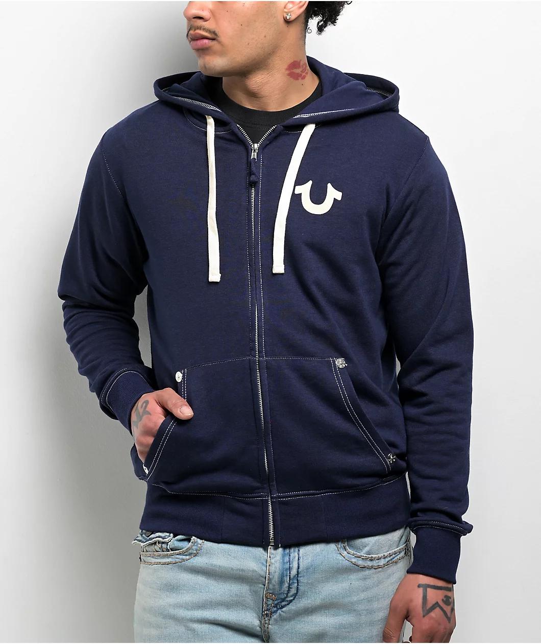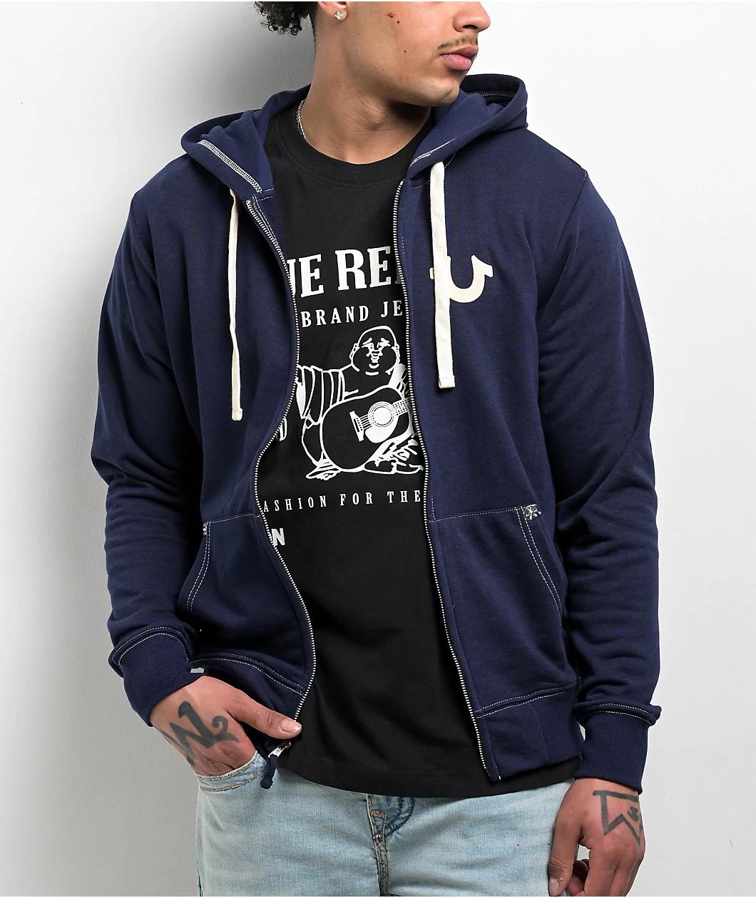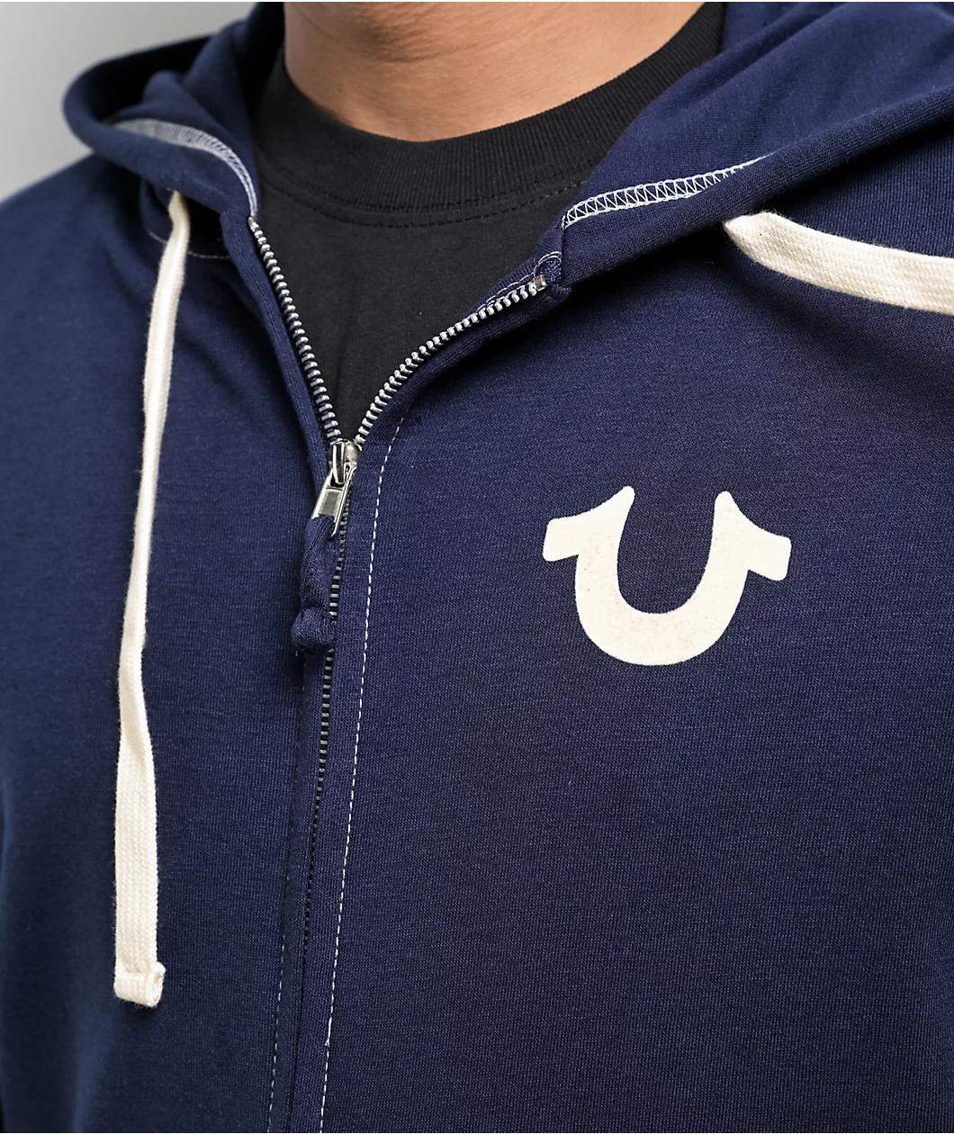 Add a Y2K vibe to any outfit with the navy blue Classic Logo Zip Hoodie from True Religion. The top features white flocked branding on the left chest and back for fuzzy texture, as well as contrast stitching throughout. The dual hand pockets are stud