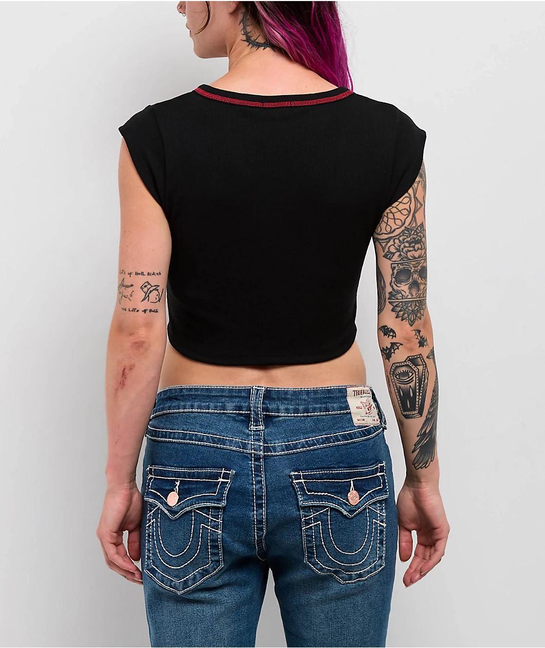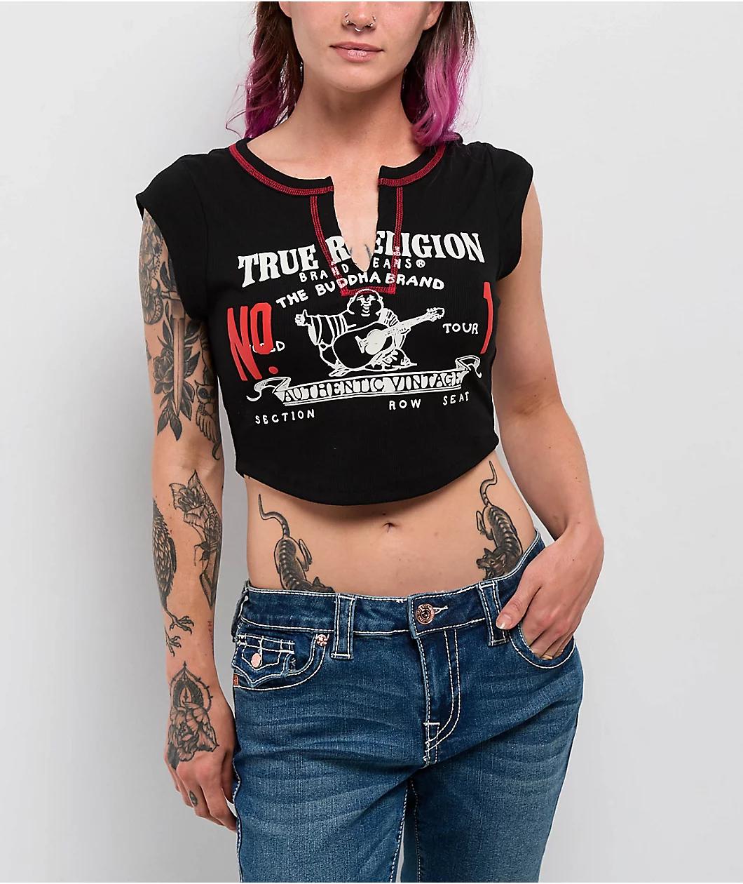 Embrace a Y2K look with the Contrast Buddha crop t-shirt from True Religion. The black crop top features a deep V notch neckline highlighted by red Contrast stitching for an eye-catching look. Screen-printed and puff-printed branding on the chest sho