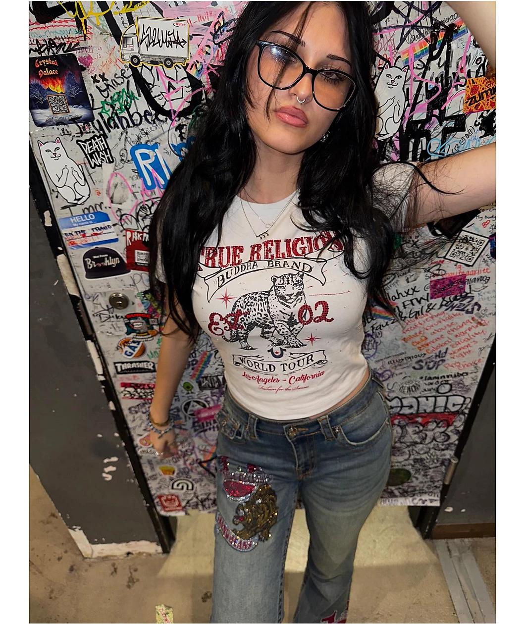 Step into the 2000s with the Crystal Leopard crop t-shirt from True Religion in a clean white colorway. Rhinestone branding and a screen-printed Leopard adds a cute vibe, pairing well with almost any bottoms. This graphic tee is finished with a ribbe