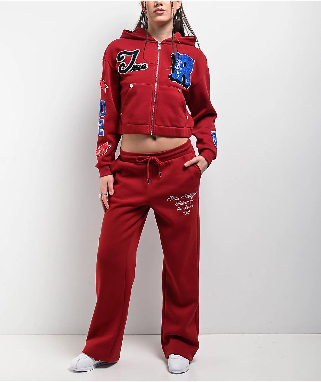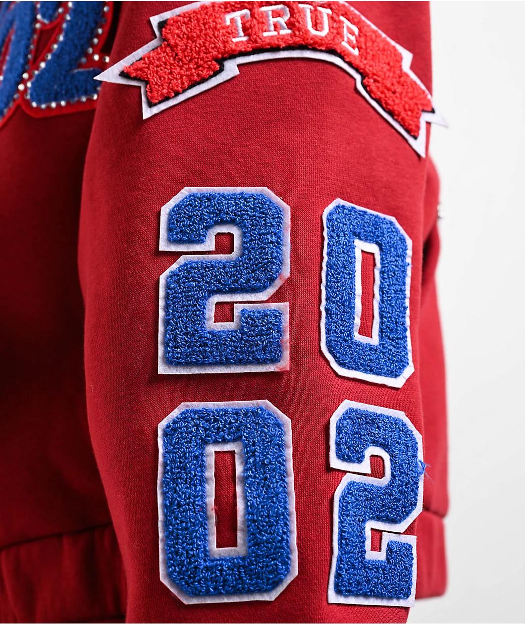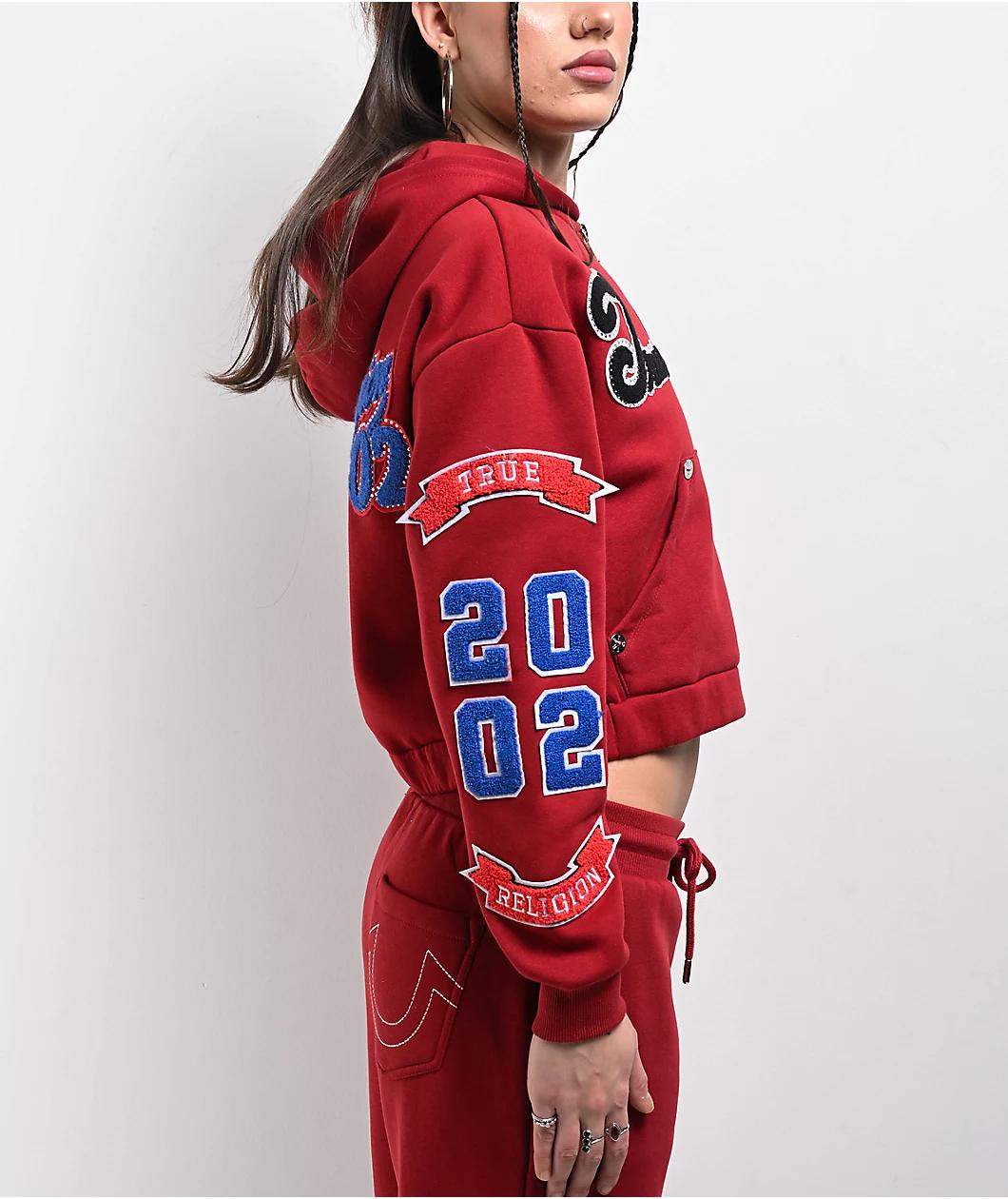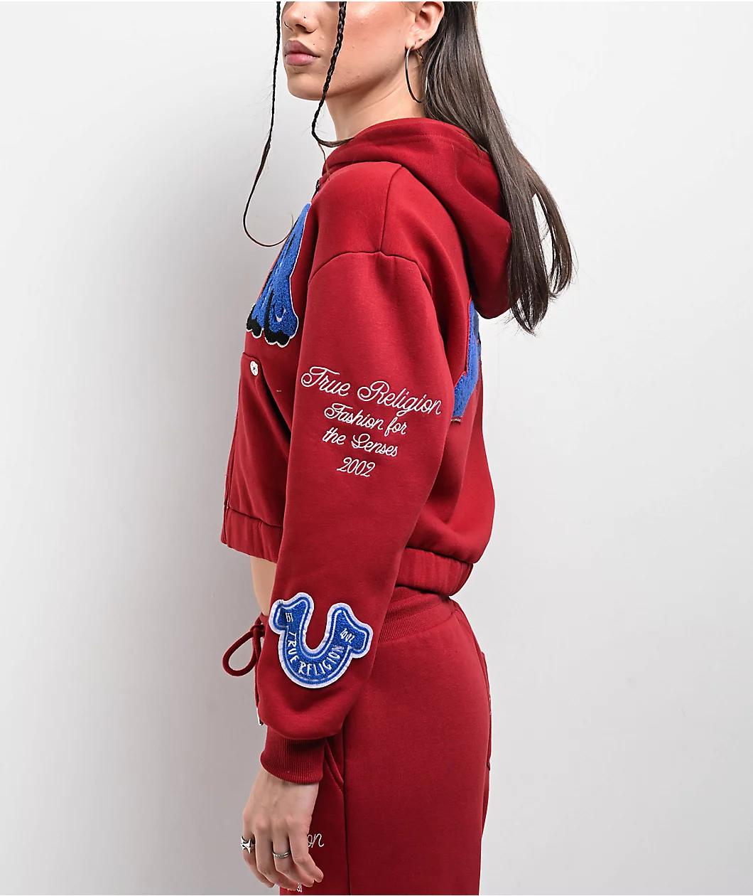 Add a bold touch to any outfit with the Crystal Patch Varsity zip hoodie from True Religion, landing with a crop fit and bold "Red Dahlia" colorway. Luxurious chenille graphics throughout feature bold branding imagery, with appliques on the right che
