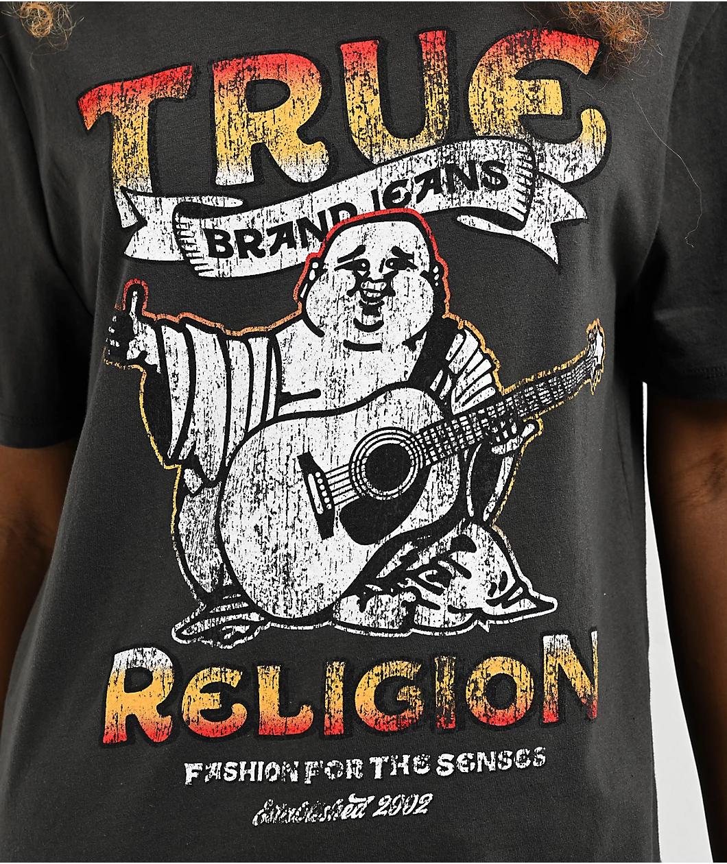 Featuring distressed detailing and a washed black colorway for a vintage, worn-in vibe, True Religion delivers the TR Logo t-shirt with a noticeable screened graphic on the front. The comfy short sleeve is made from 100% cotton in an oversized, boyfr
