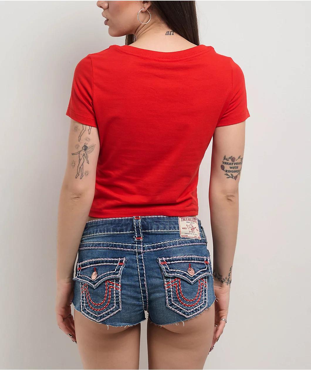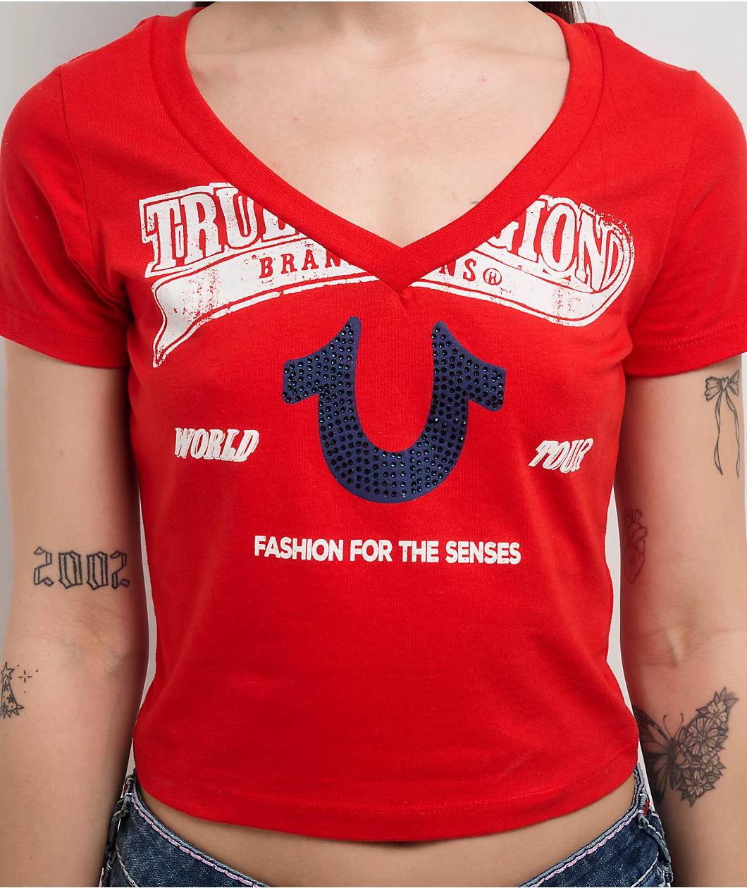 Influenced by sports uniforms, True Religion proudly presents the Horseshoe t-shirt in a bright "Scarlet" red cotton blend with a slim, cropped fit and a stylish V-Neck collar. Adorned on the front with contrasting navy blue rhinestones on the printe