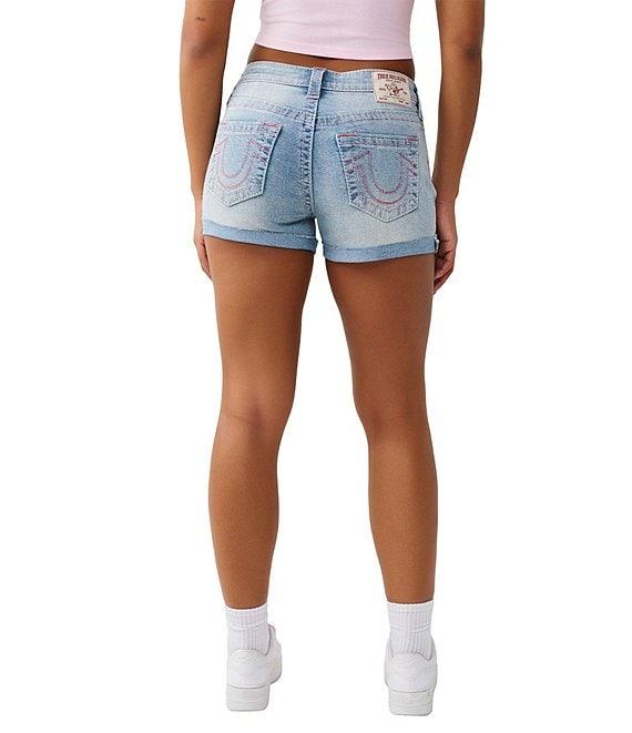 From True Religion, this short features: Denim fabrication Mid-rise waistline Rolled hemline Front button and zipper fly closure Classic 5 pocket styling Horseshoe embroidered back pockets Big T contrast stitching Approx. 4" inseam, 12" rise, 27" leg opening Cotton/polyester/rayon/elastane Machine washable Imported.