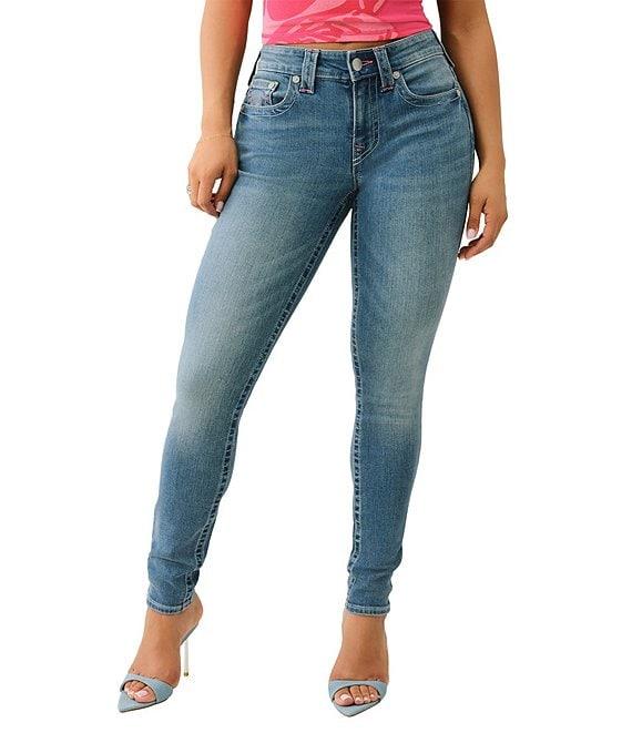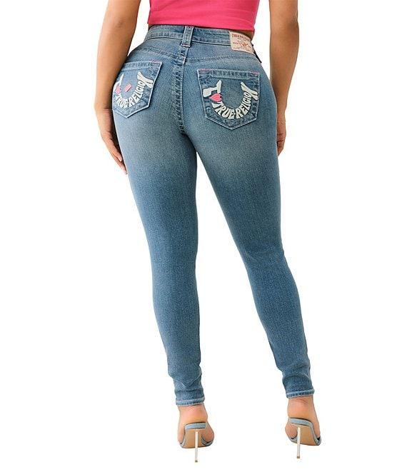 From True Religion, these jeans feature: Stretch denim fabrication "I Love True Religion" embroidered text on the back pockets Mid rise Skinny leg Tonal stitching 5-pocket style Belt loop Slim fit Button front/zip fly closure Approx. 29" inseam; 8 3/4: front rise; 9 1/2" leg opening Cotton/polyester/rayon/elastane Machine wash Imported.