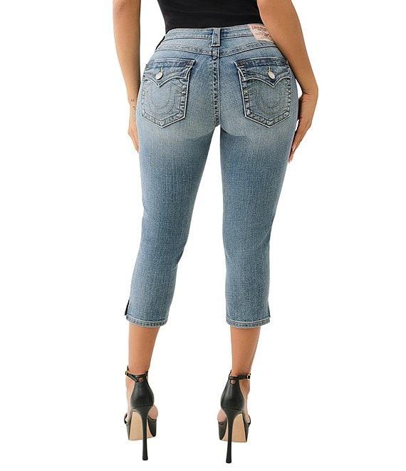 From True Religion, these jeans feature: Soft stretch denim fabrication Mid-rise 5 pocket styling Front button/zipper closure Horseshoe detailing along the back flap pockets Capri length Approx. 21" inseam, 8 1/4" rise, 12 3/4" leg opening Cotton/polyester/elastane Machine wash/tumble dry Imported.