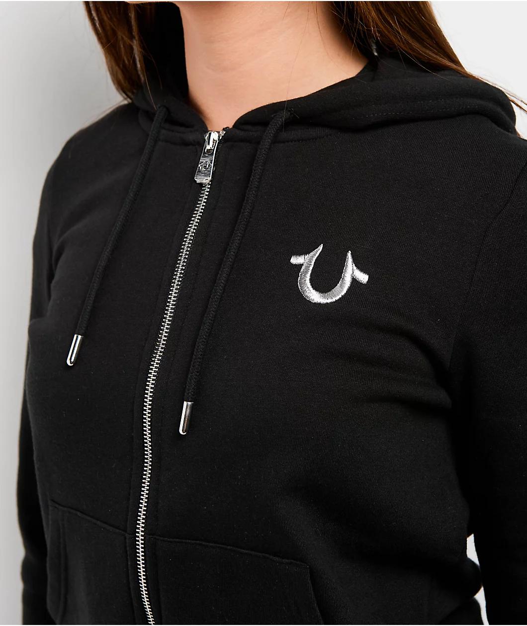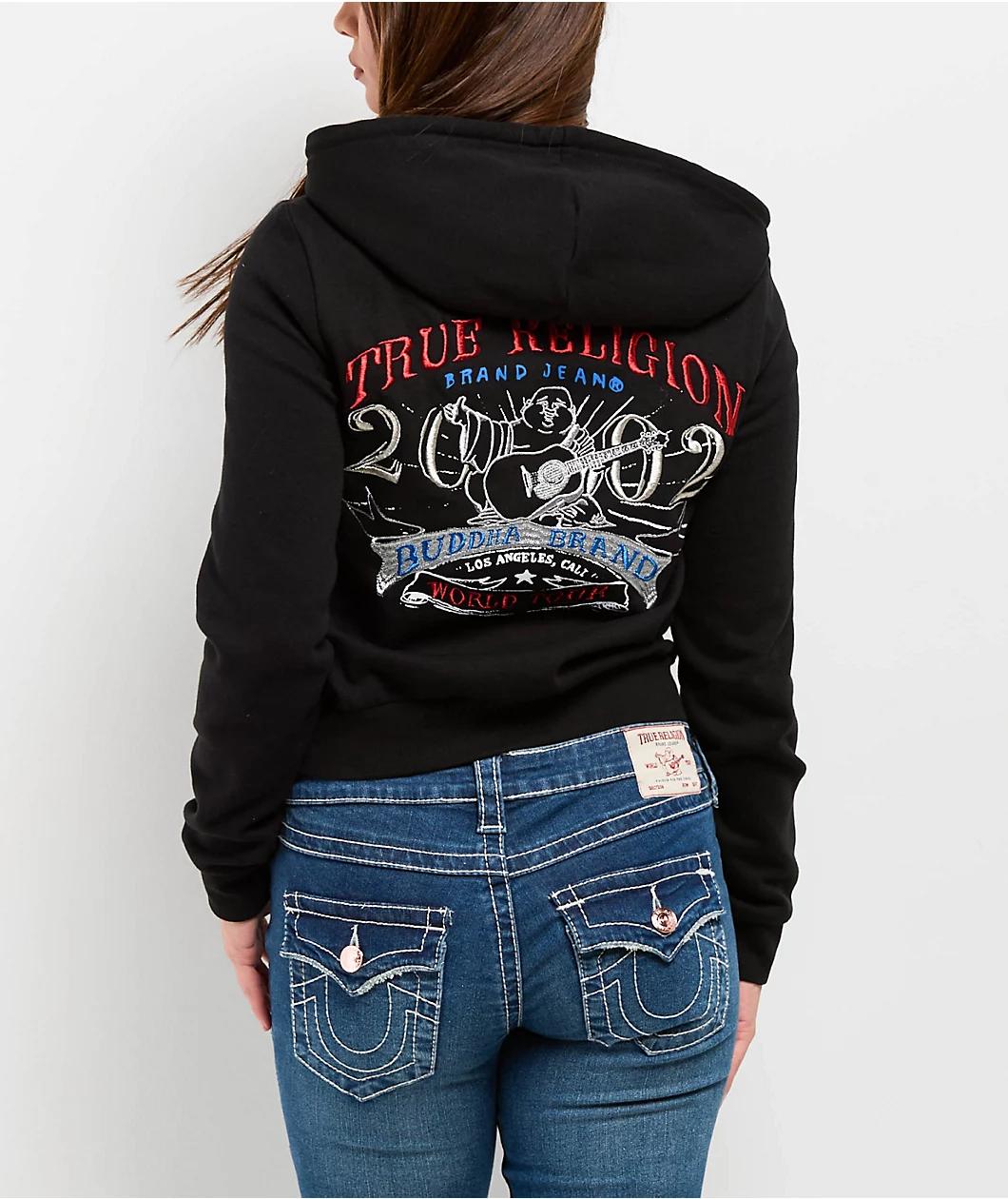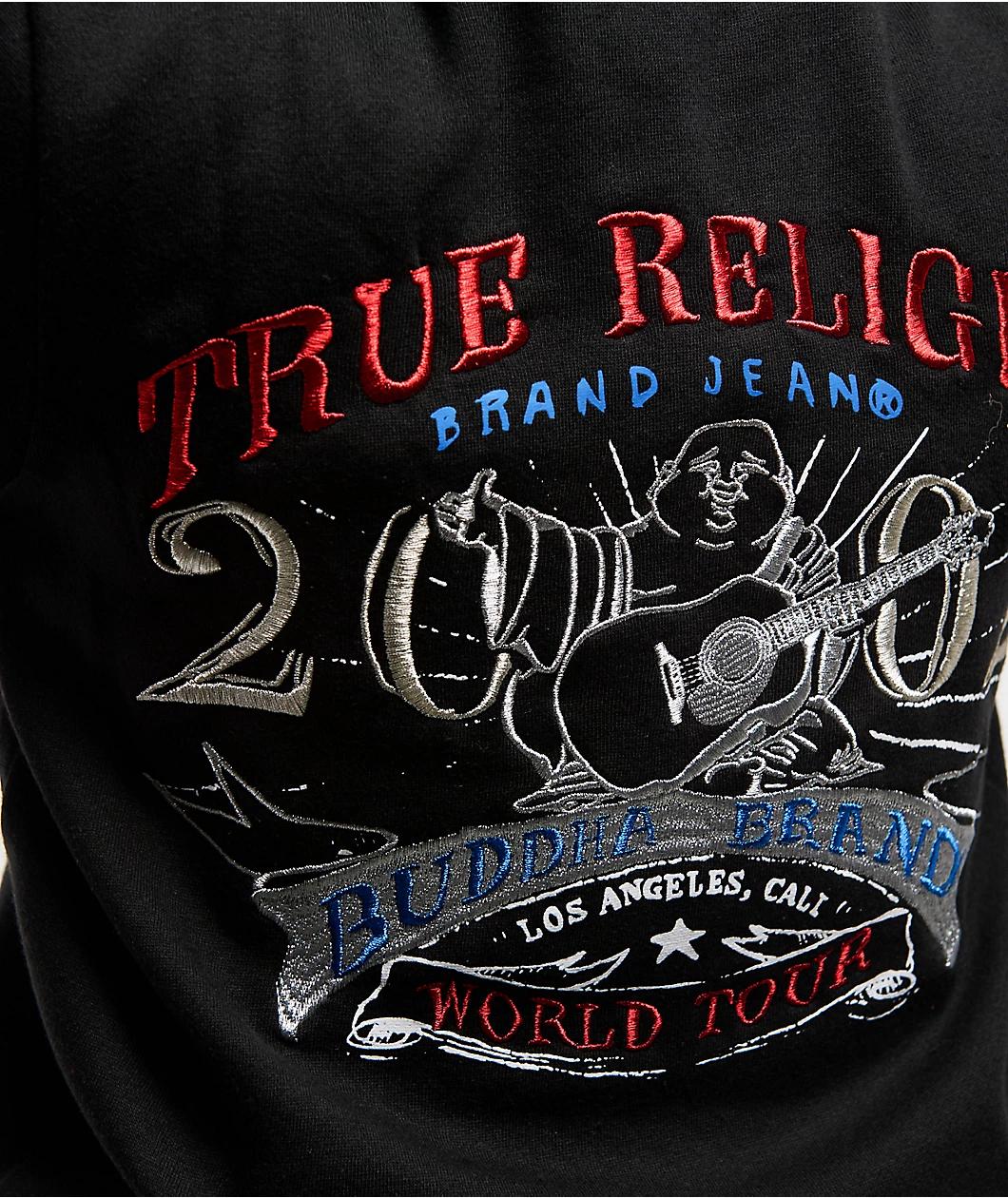 Add throwback Y2K style to any outfit with the Lurex World Tour zip hoodie from True Religion. Landing in a classic black colorway, the hoodie features silver Buddha branding embroidered on the back with red and blue brand text for a pop of color. A