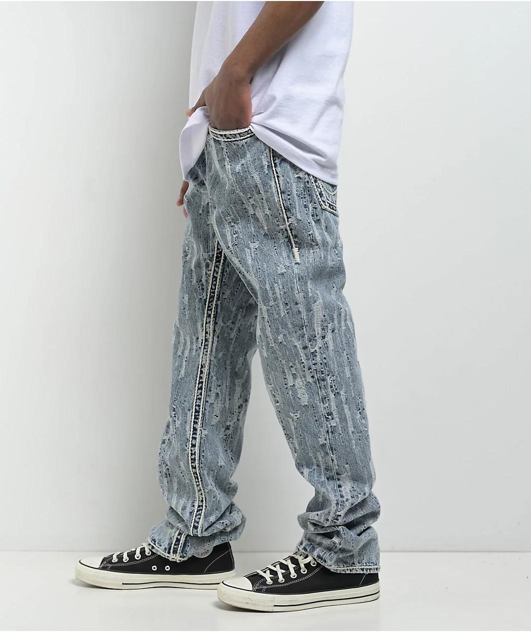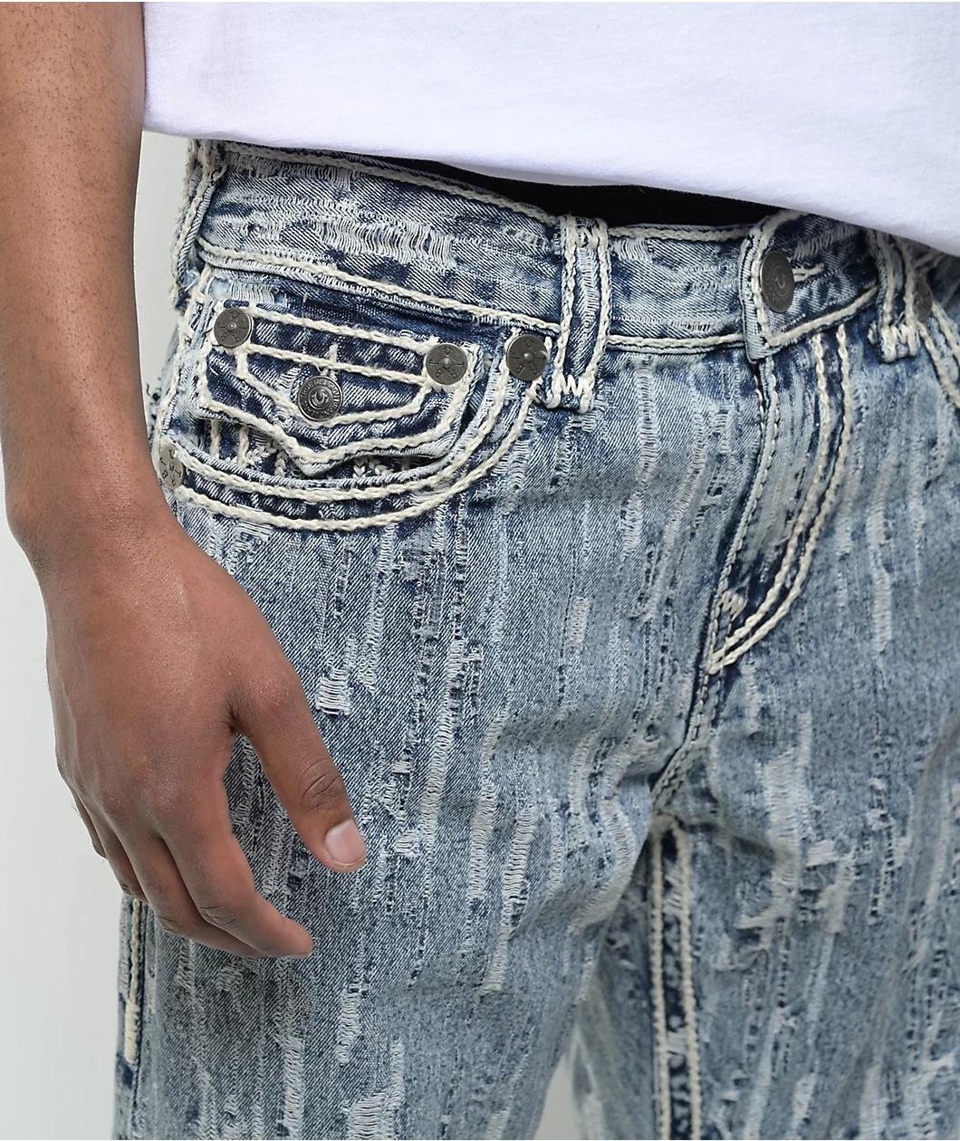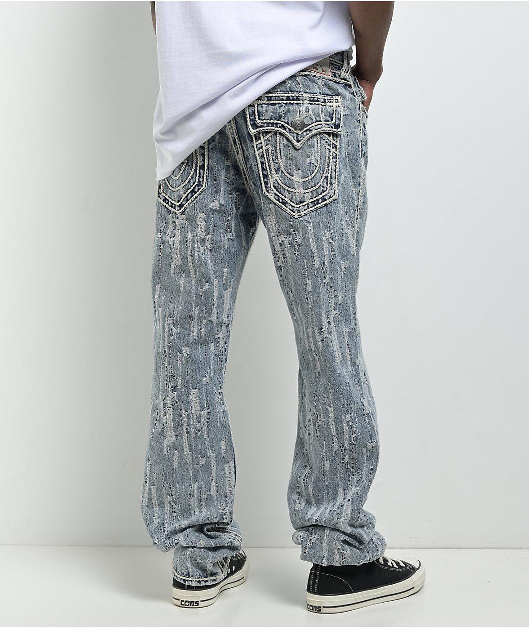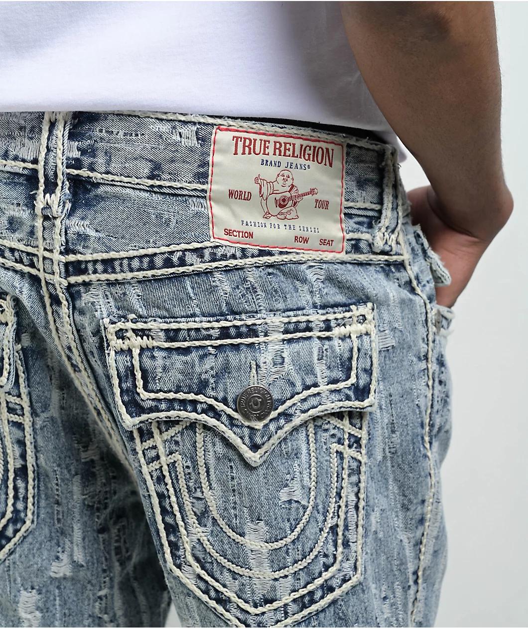 Featuring exaggerated vertical rips and tears throughout, the straight leg Ricky Distress jeans from True Religion land in a washed blue denim with white contrast stitching and embroidered branding. The relaxed maximalist pants lend secure safekeepin