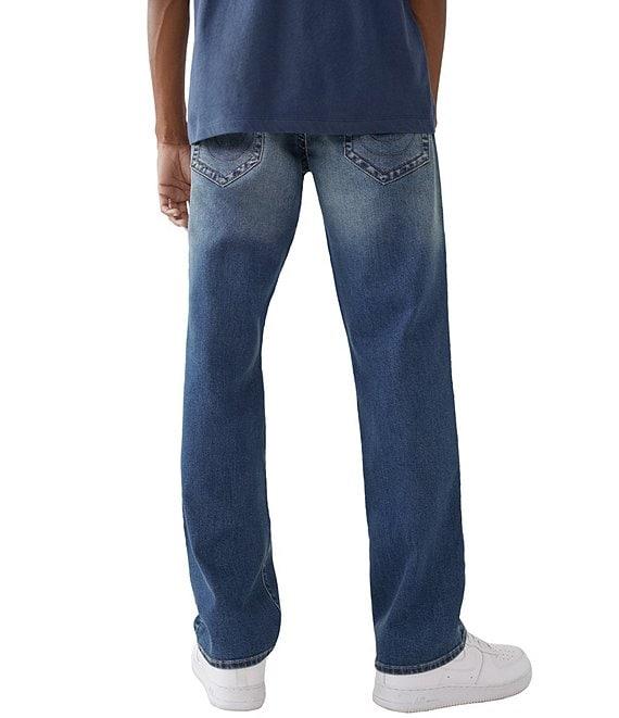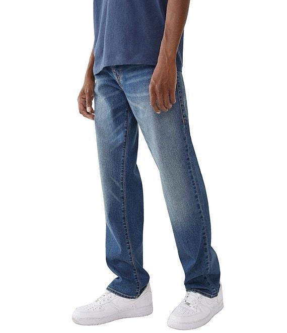 From True Religion, these jeans feature: straight fit zippered fly with button closure; belt loops two front pockets (one with coin pocket) horseshoe stitching on the two button-flap back pockets single-needle stitching detail 32" inseam In a soft, stretch denim fabric of cotton/polyester/elastane machine wash/tumble dry Imported.