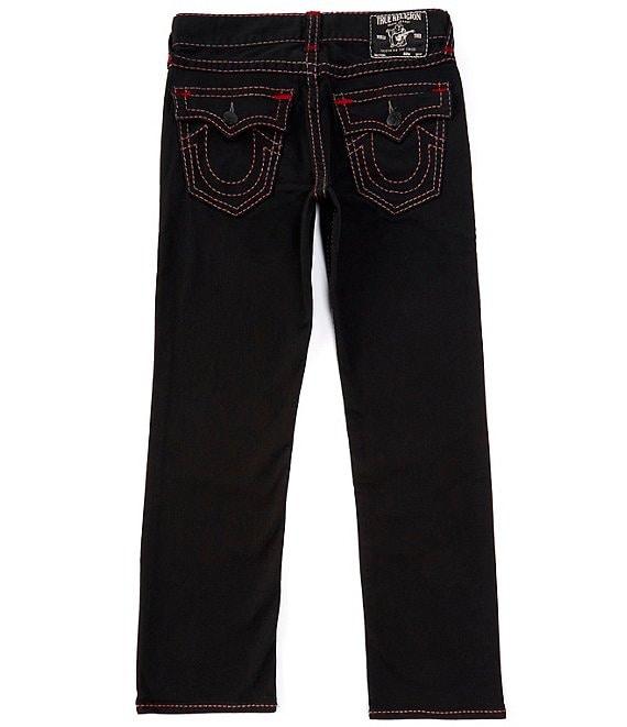 From True Religion, these jeans feature: Regular fit Belt loops Zip/button-front closure 5-pocket styling Pickstitching and horseshoe embroidery on the button-flap back pockets Tonal stitching detail 34" inseam Cotton denim Machine wash/tumble dry Imported.