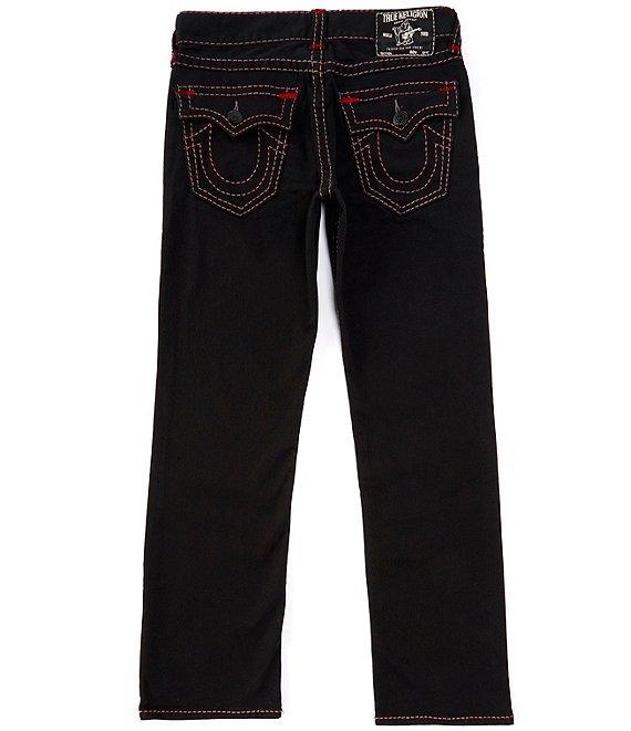 From True Religion, these jeans feature: Regular fit Belt loops Zip/button-front closure 5-pocket styling Pickstitching and horseshoe embroidery on the button-flap back pockets Tonal stitching detail 34" inseam Cotton denim Machine wash/tumble dry Imported.