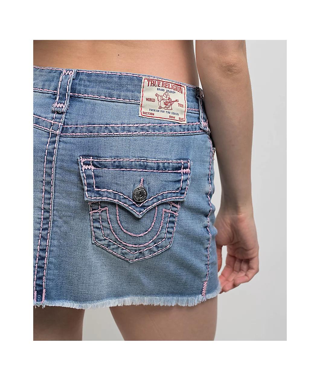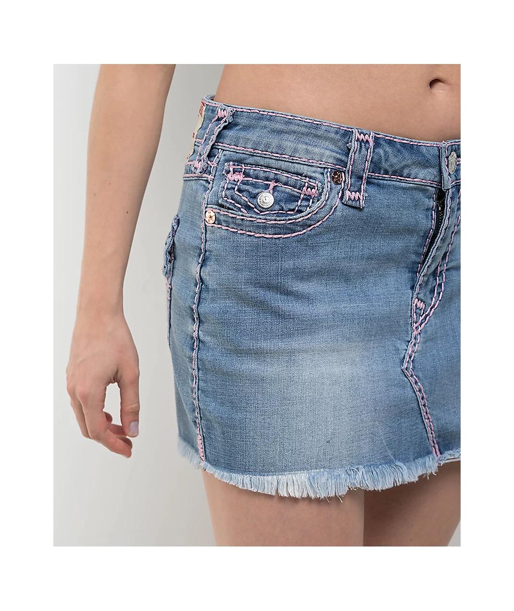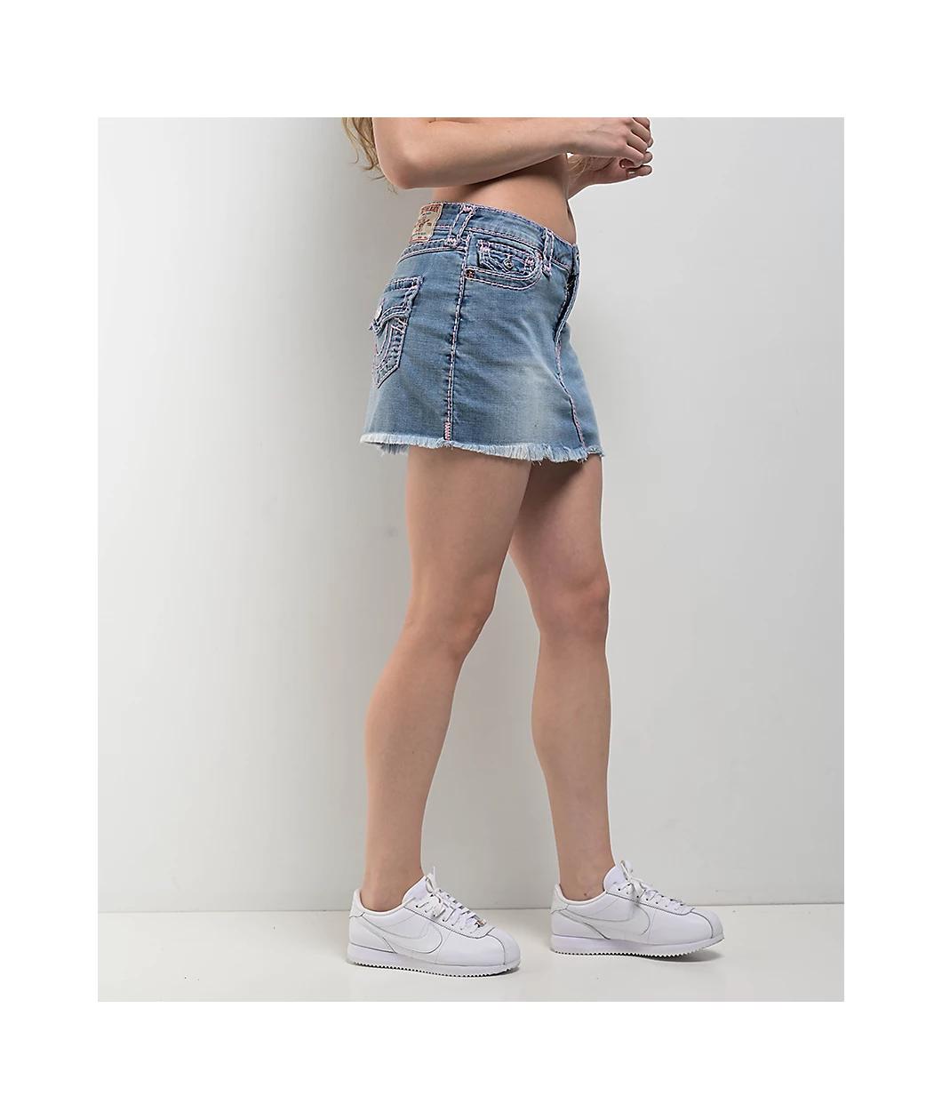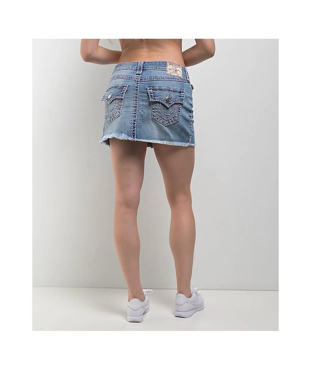 True Religion welcomes the Sadie Super T mini skirt in an "Aqua Marine" blue denim construction with noticeable contrast stitching throughout and a washed treatment for a faded appearance. Lending a DIY cutoff vibe, the cotton blend skirt features a