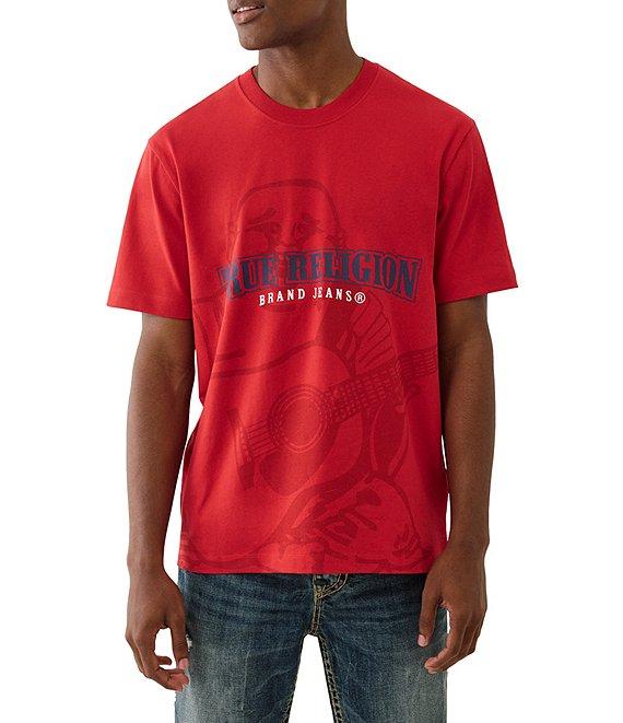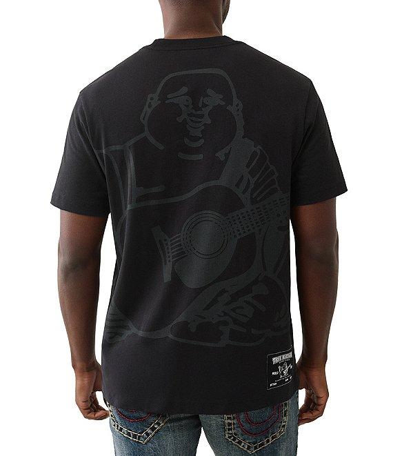 From True Religion, this t-shirt features: Crew neckline Short sleeves Horseshoe design and "True Religion" logo and "Buddha" character graphic on the front "Buddha" character graphic on the back Pullover construction Cotton Machine wash/tumble dry Imported.