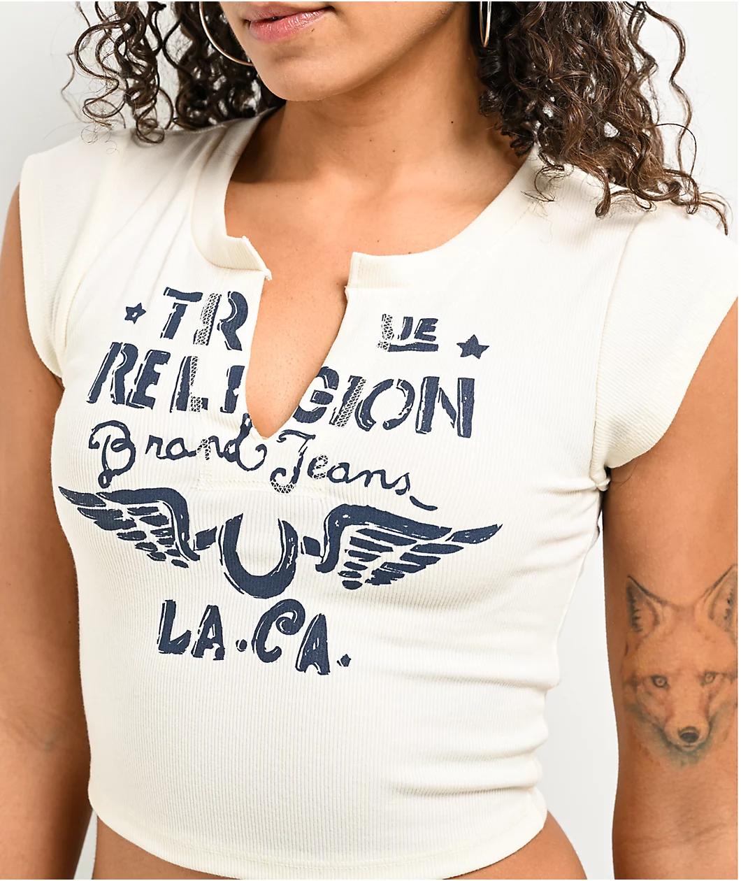 True Religion presents the V Notch t-shirt in a natural beige colorway with a ribbed construction throughout and a cropped silhouette for a stretchy, form-fitting look. Made using a breathable polyester blend, the chest features screen-printed brandin