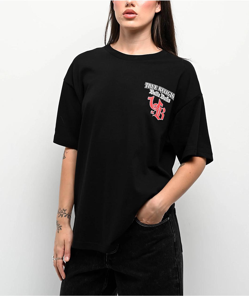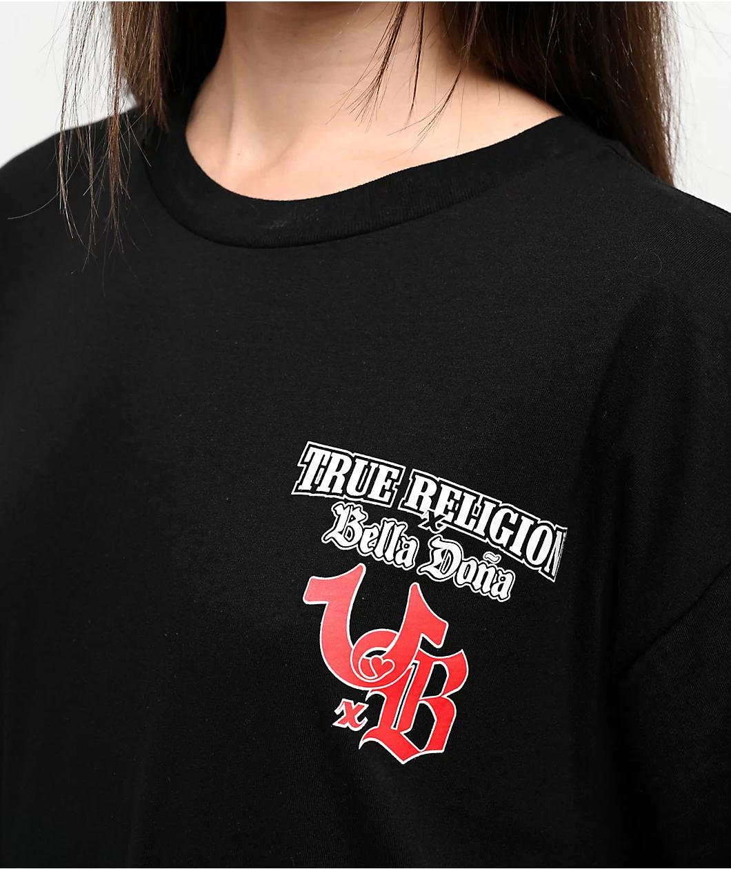 True Religion and Bella Doña team up for the Oversized Boyfriend black t-shirt, fusing bold West Coast energy with classic streetwear. The front shows both logos intertwined on the left chest, while the back features a full graphic of a Latin girl in