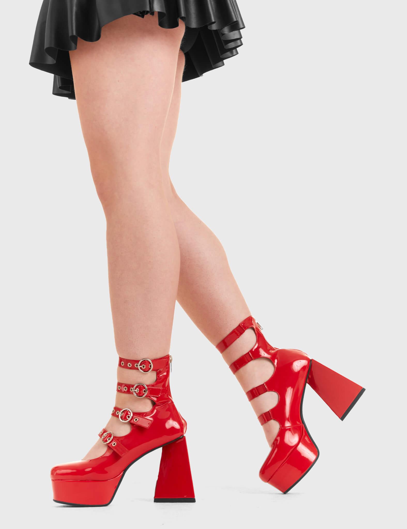 BUCKLED UPTrue Romance Platform Heels in Red patent. These platform boots feature four silver buckles with adjustable straps, keeping it nice and classy. Made with eco-friendly materials and 100% cruelty-free, these platform boots are as ethical as they are edgy.- Platform Height- Silver circle buckles- Adjustable straps- Triangle heel- High Heel- 100% vegan SKU: LMF 3328 - RedPAT