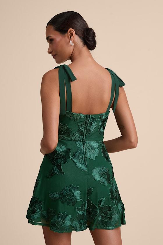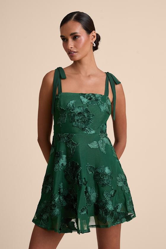 Everyone you meet will be instantly charmed by your style, thanks to the Lulus Truly Inspiring Dark Green Mesh Floral Applique Tie-Strap Mini Dress! A sheer mesh overlay (atop a matching knit liner) features trendy three-dimensional floral appliques throughout as it shapes this sweet dress that features a sleeveless bodice, a sleek straight neckline, and long slender straps that tie at the shoulders. The high, fitted waist tops a breezy, skater-style skirt that finishes at a flirty mini hem. Hidden back zipper/clasp.