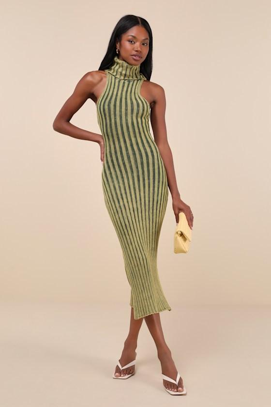 Everyone will be drawn to an effortlessly stylish babe like you in the Lulus Truly Magnetic Washed Green Ribbed Turtleneck Midi Sweater Dress! Stretchy ribbed knit (with a washed effect throughout) shapes this trend-setting sweater dress with a chic turtleneck and a sleeveless bodice. The figure-hugging silhouette flaunts your curves just right as it continues into a column midi skirt with slits on each side for movement.
