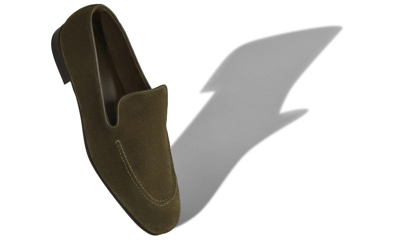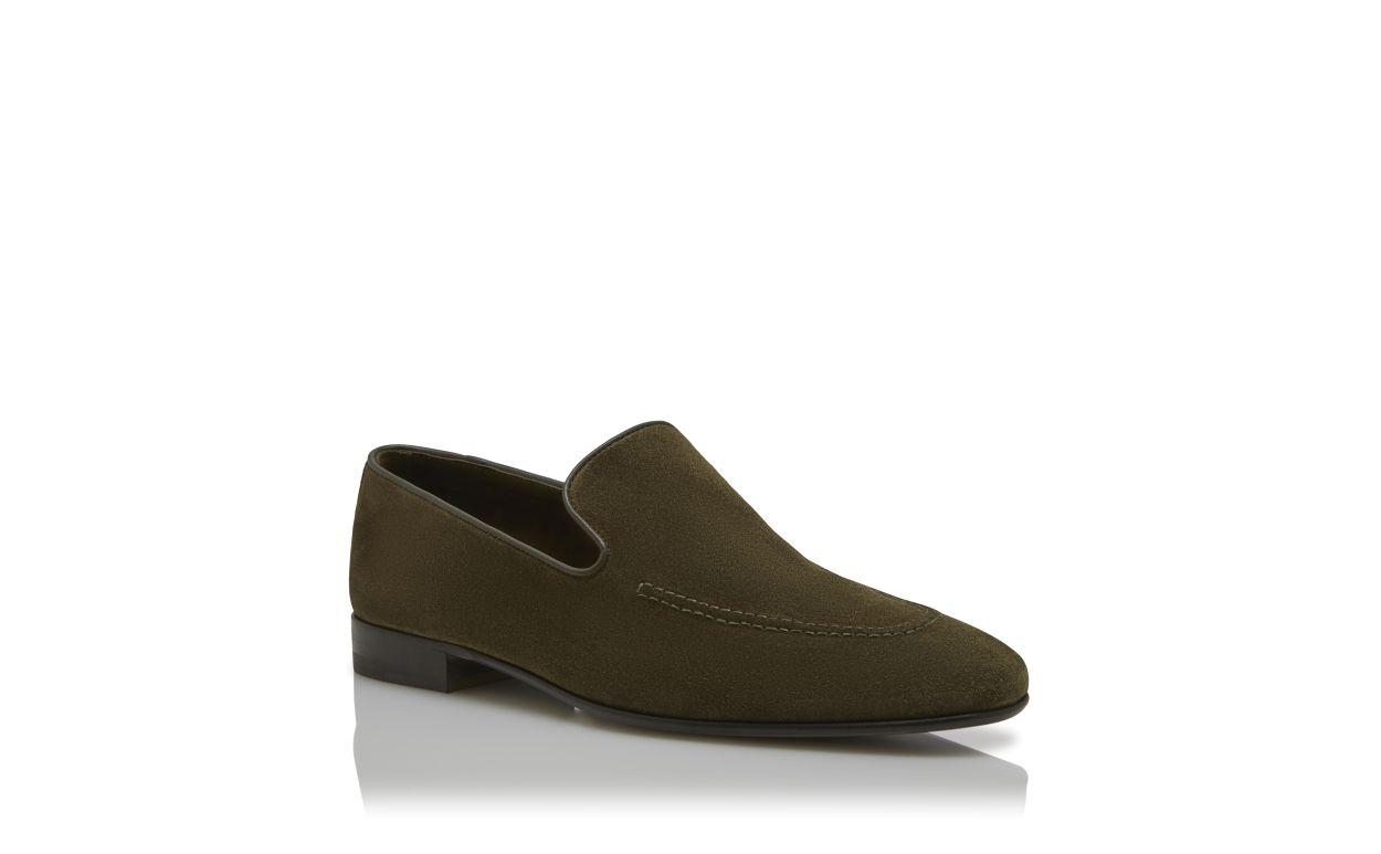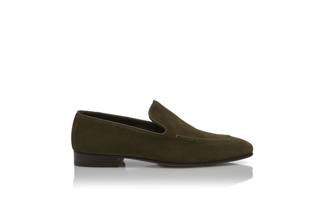 Dark khaki calf suede loafers featuring apron cut design with calf leather trim.