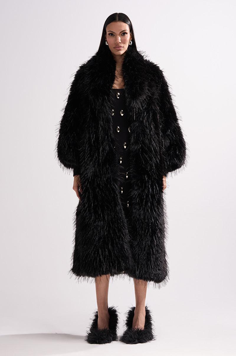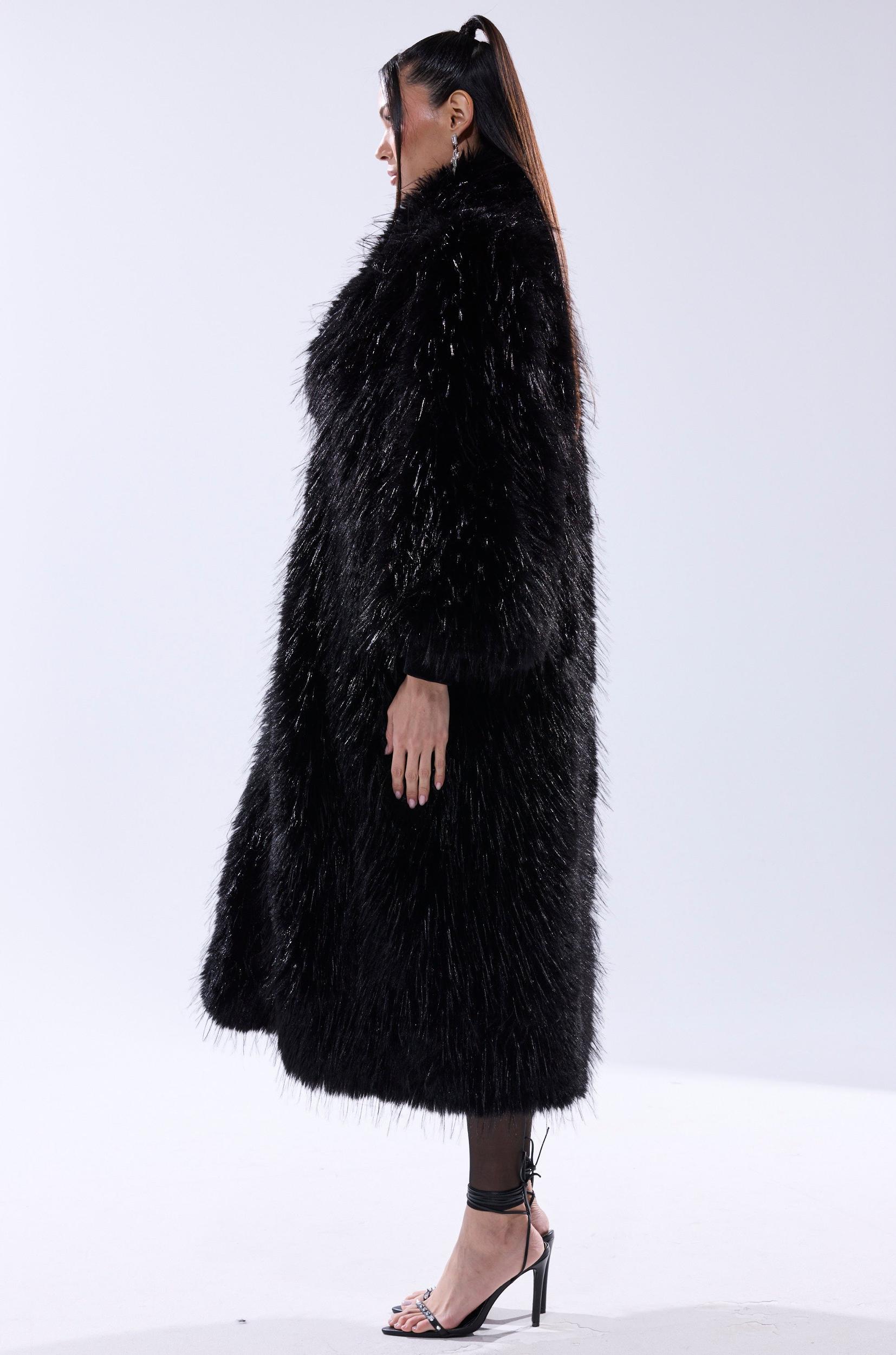 The AKIRA Label Tsunami Faux Fur Coat In Black is a wave of pure drama. Crafted from ultra-fluffy, wispy faux fur, this extravagant coat features an oversized shawl-style collar, long sleeves with ribbed knit cuffs, on-seam waist pockets, concealed front hook-and-eye fastenings, and a satin inner lining. Complete with a longline silhouette. - Faux Fur: 100% Polyester, Lining: 100% Polyester- Dry Clean Only- No Stretch- Imported (all measurements approximate from size S/M)- 50” Shoulder to Hem- 17” Shoulder to Shoulder- 23” Sleeves- Model is 5’11” and is wearing size S/MProduct ID: 1064914