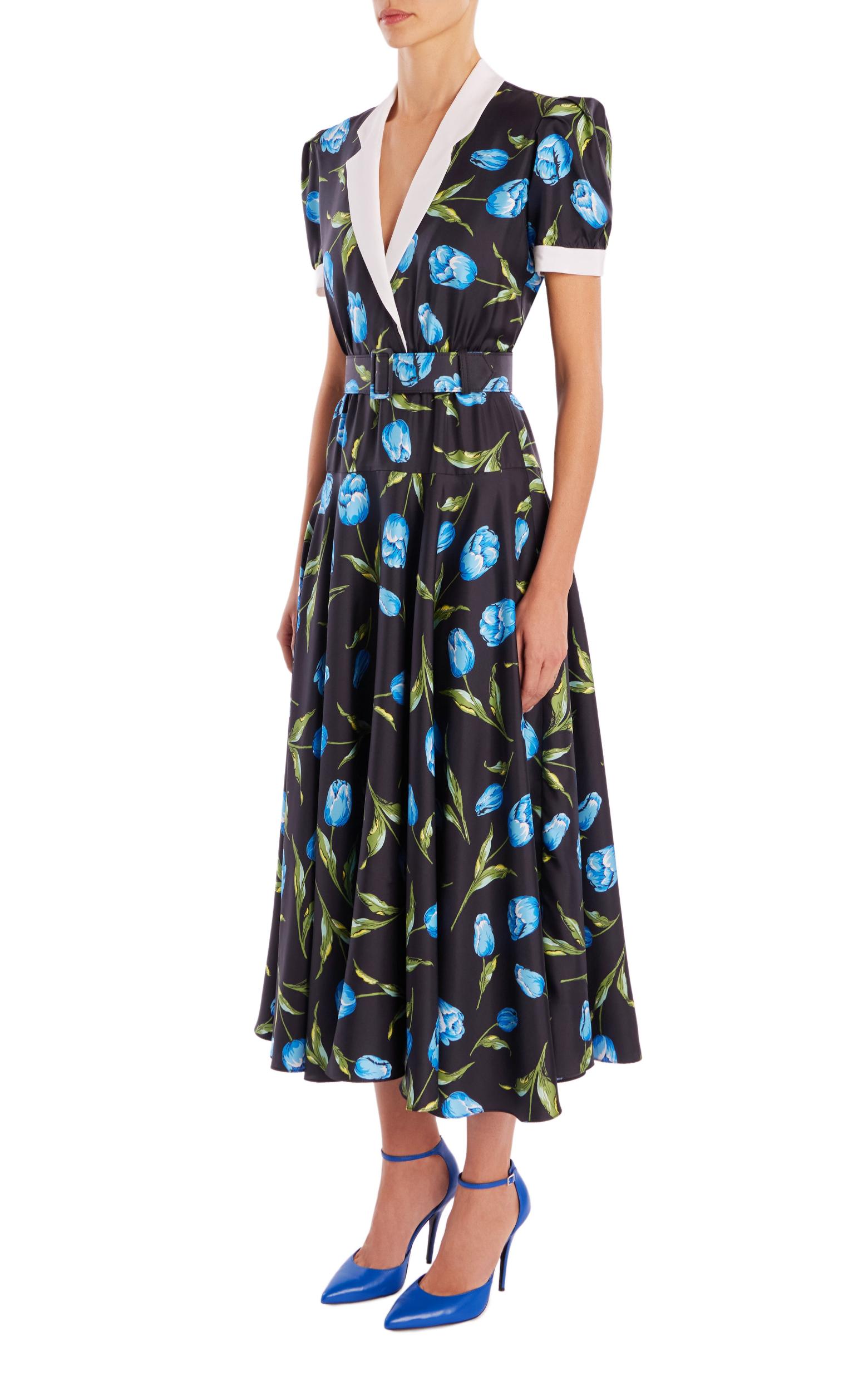 This intriguingly feminine midi cut in elegant tulip printed silk twill is accented with a white silk crepe de chine notched collar and band cuffs. Lightly padded shoulders emphasize the puffed sleeves. Neatly tailored with a waist-cinching self-belt, the yoke circle skirt creates graceful movement with your every step.