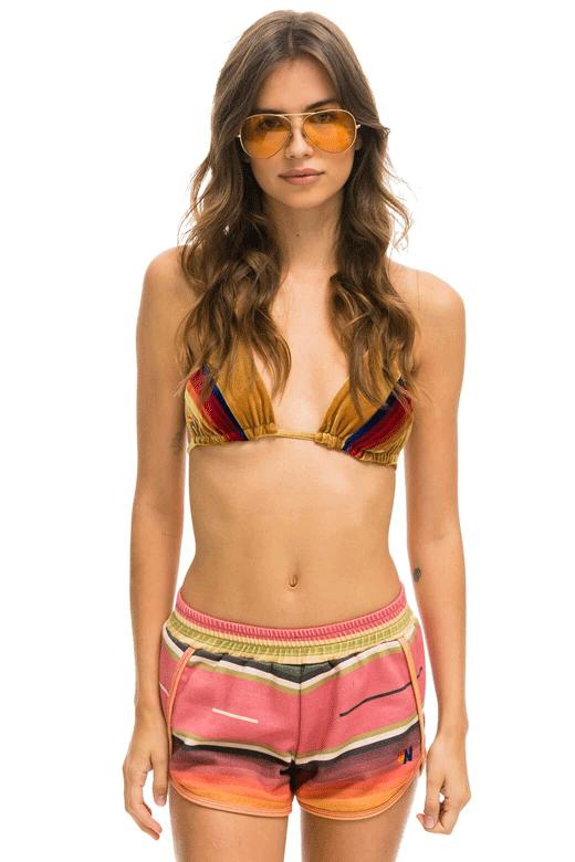 Our single needle stitch work gives each garment a unique, one of a kind effect. All of our products go through an intense breaking-down process that gives them a vintage feel you'll love because it's broken in from day one of wearing it. You're going to live in these shorts. - Handmade with a whole lotta love right here in Los Angeles- Female model wearing size XS.- Tri-Blend Fabric: 50% polyester, 38% cotton, 12% rayon- Machine wash inside out on cold with like colors. Line or air dry. Do not iron on decoration.